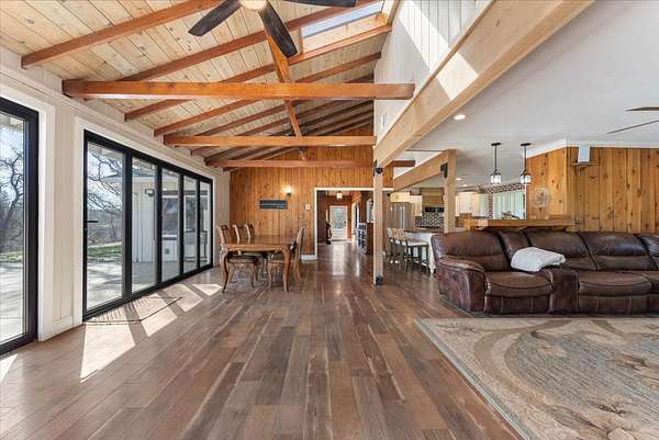 - LIVING ROOM: Large room with fireplace in the brick hearth, large windows, and skylight