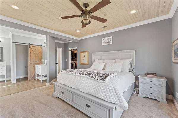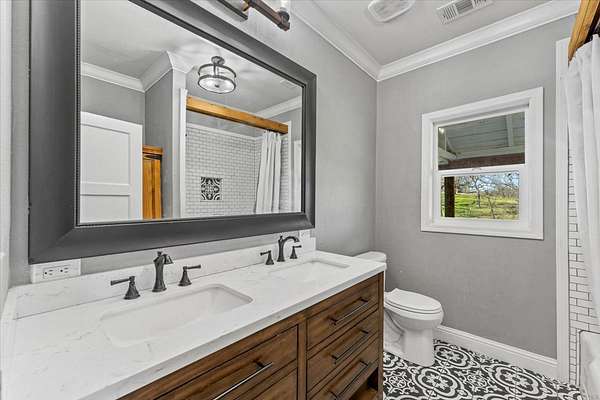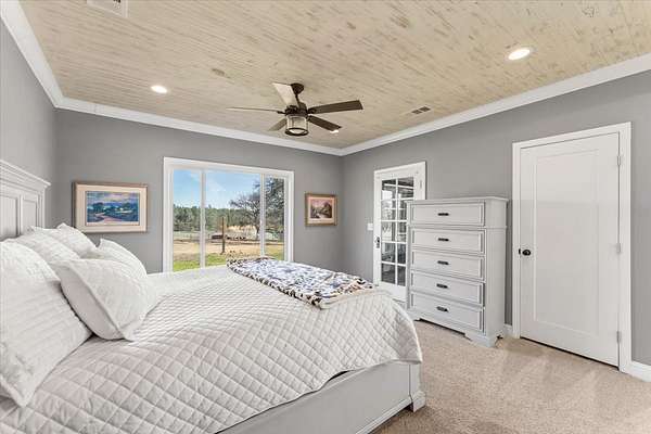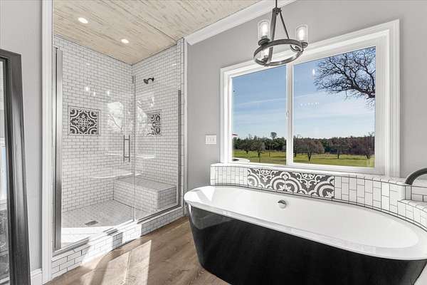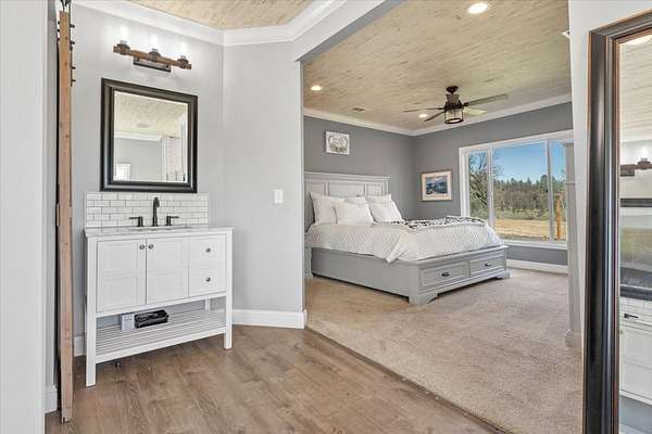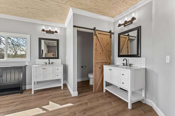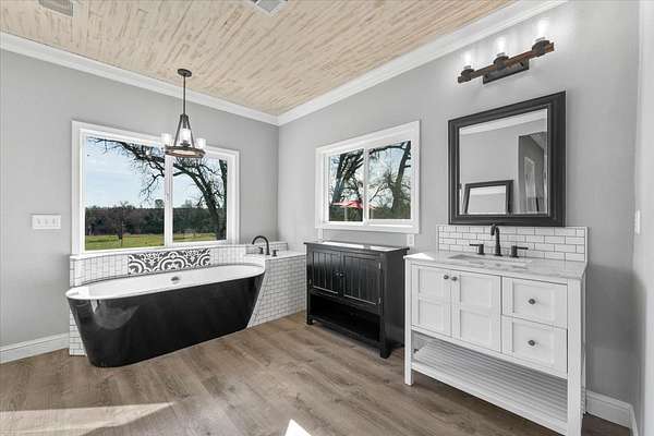- OWNERS SUITE: This is a large room with a door to the patio, pool, and spa, a ceiling fan, two walk-in closets, a wonderful bath with a soaking tub, tile shower, farm vanities, and a door.