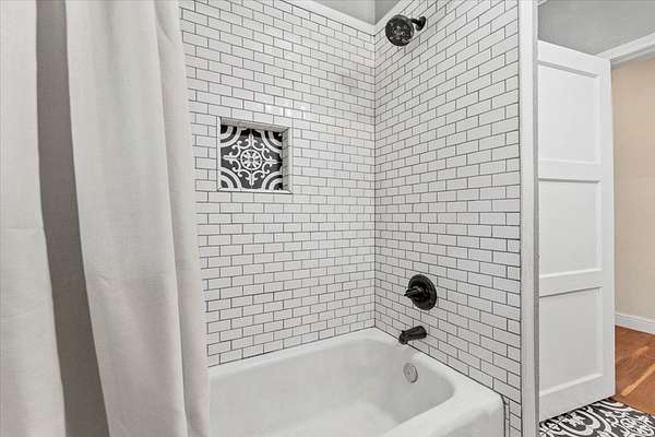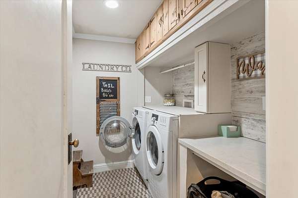 - TWO BEDROOMS, BATH AND LAUNDRY: Both bedrooms have old-style closets with built-in drawers and ceiling fans. The bath has dual sinks and a tile shower over the tub. The laundry room is off the hallway and has a folding counter and storage cabinets.
