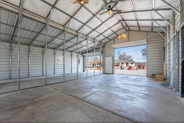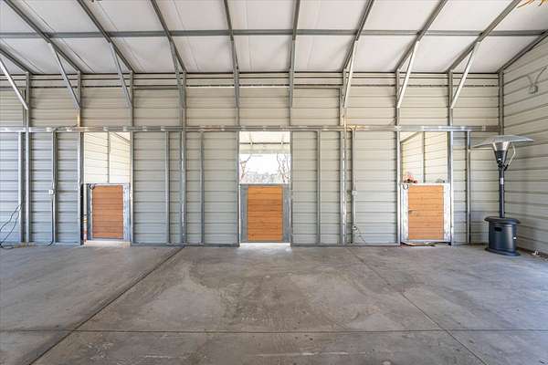 - METAL BARN: 42X28 barn with concrete floor. 3 stalls on one side. 3 roll-up doors and one-man door. Large lights and fans. Additional material is available to create areas opposite stalls.
