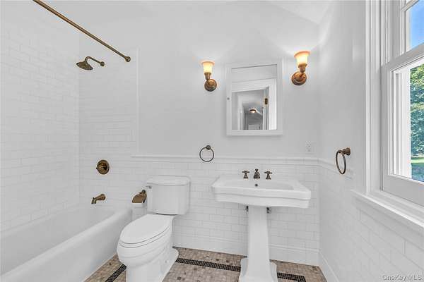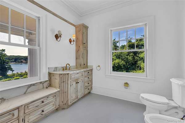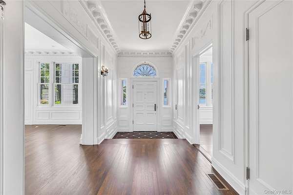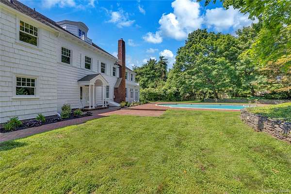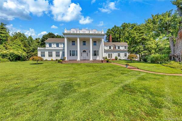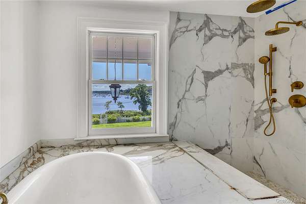Spectacular restored Georgian Colonial Mansion on 2.6 acres and 400 feet of waterfront! Yes! 400 feet of direct waterfront on Huntington Bay with spectacular views from every room. 7 bedroom, 7 bath, eat-in kitchen, formal living room with large fireplace, and other unique rooms. This 1917 updated home with incredible original details inside and out, and modern amenities including 7 zone central air conditioning throughout. Updated kitchen with fireplace and 7 bathrooms. Master suite with separate his and her bathrooms and closets, and even a waterview from the sunken bathtub! In-ground sprinklers, generator, shower/steam room, refinished wood flooring throughout, updated electrical, updated plumbing, and new gas boiler-hot water heater. High ceilings and unique architectural details throughout. Original brick patios, large Roman in-ground gunite pool. Large 3 car garage with high ceilings and huge 1,000 sq ft room above garage with 12 foot ceilings. Quality fenced in property with new driveway. Taxes are only $48,721.18