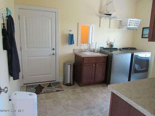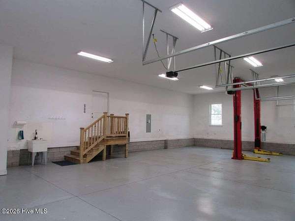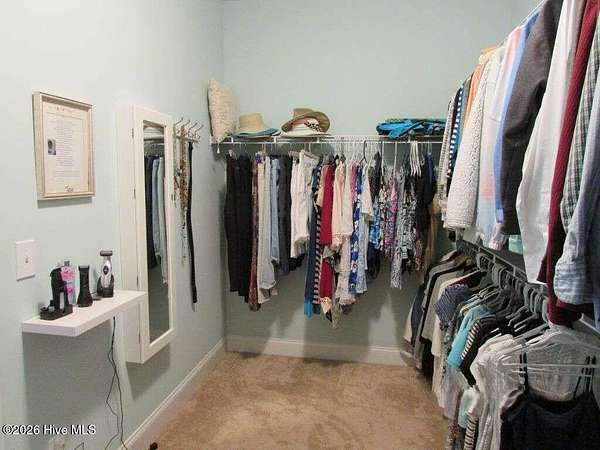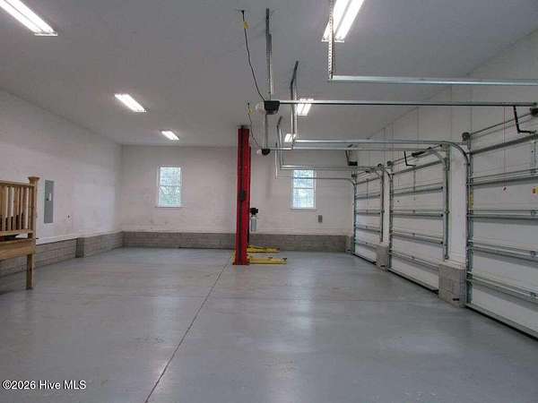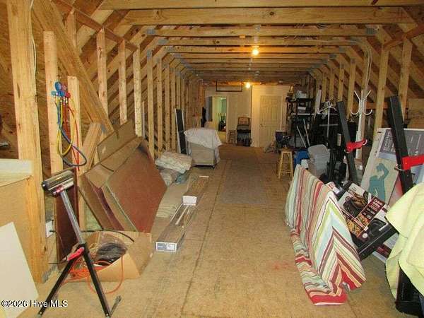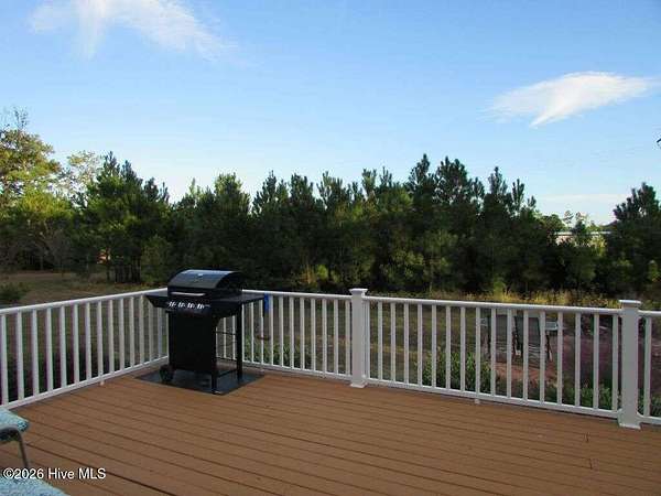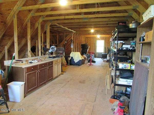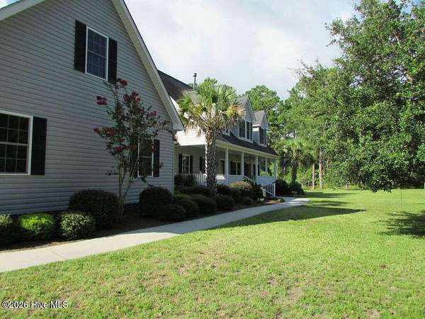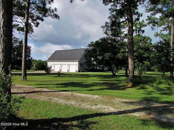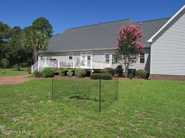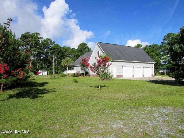 This custom built home with 9' ceilings is on a quiet street offering plenty of privacy, wildlife, & a pond. Six miles from Surf City beaches and 3 miles to the Intracoastal waterway w/boat ramp. Southern charm greets you on the front porch perfect for relaxing to the sound of birds in the trees. Out back, a large deck offers sunshine, southern breezes, star gazing & relaxing in the hot tub. Fire pit and complete irrigation system. One floor living, split floor plan with master suite on one side & two bedrooms on the other. The master suite is spacious with a large walk-in closet, private bath with soaking tub, walk-in shower, and linen closet. Open concept living room, kitchen, and dining. The kitchen provides ample cabinets with pull out shelving on all lower cabinets, tile back splash, solid surface counter tops, pantry and a bar with seating for four. Adjacent to the dining area is a space for an office or den with a pocket door for privacy. The two secondary bedrooms are located on this side of the home offering private living space. There is a full bath located between the two secondary bedrooms. Finished bonus room with closet that could serve as a fourth bedroom or rec room. The large laundry/mud room has a sink, storage cabinets, half bath, and leads to the attached garage. Car enthusiasts & hobbyists will appreciate the attached, 28' x 48' garage with 12' ceilings. The garage is insulated, sheet rocked, wired for 220v, plumbed, heated and cooled. The garage currently has a lift that does not convey but is negotiable. There is access from the garage and house to an additional 1068 sf of wired, unfinished walk-up attic space to serve as storage or living space. If that's not enough space there is an additional 24 x 24 detached garage, wired, and plumbed! Remote controlled 360 degree TV antenna in attic. New heat pump & air handler in 2025! Ring doorbell. Short distance to private grass strip airport with hanger space. No HOA!