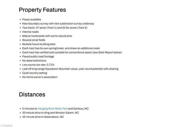 Est $1,764/mo37 acres (Tract 1) located one mile from the Dan River, and five minutes from downtown Danbury and Hanging Rock State Park with internal roads, mature hardwoods with some natural pine, several small fields, and multiple building site options. Tract contains it's own spring/creek, and shares an additional creek with Tract II (20.8± acres also available for sale). Paved public road frontage. No deed restrictions. County property tax rate is 0.71%. Leaf-off long-range views of the Sauratown Mountains; year-round views possible with tree clearing. 30 minutes to Winston Salem and King, and 45 minutes to Greensboro, North Carolina. Visit listing agents website to watch video tour and access maps. Agent owned