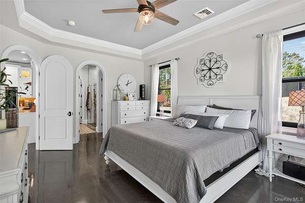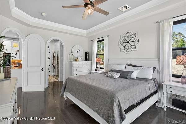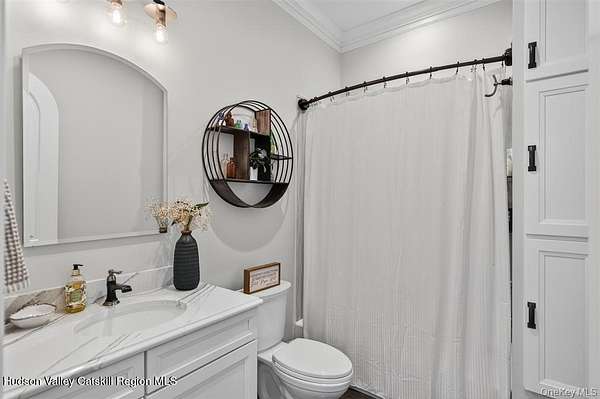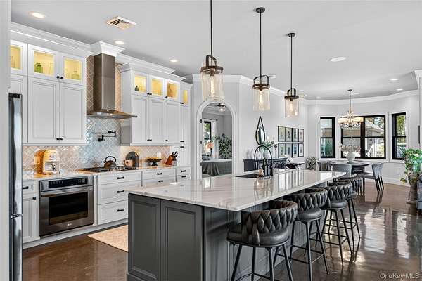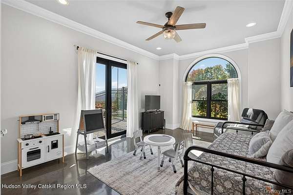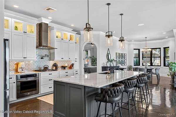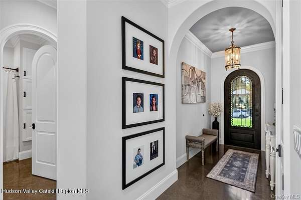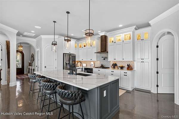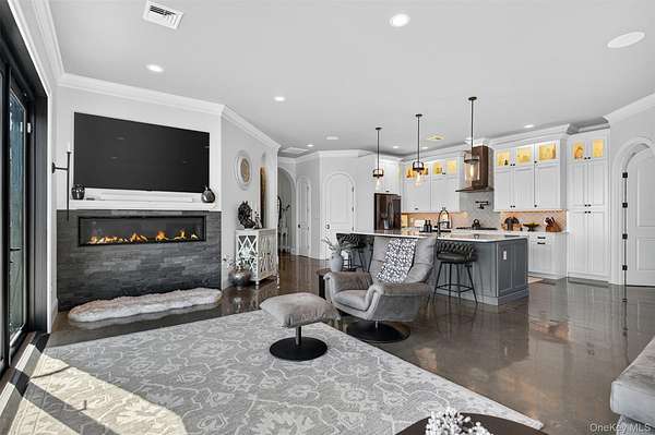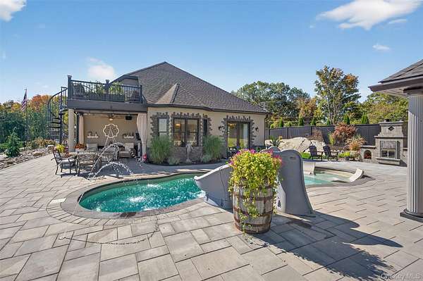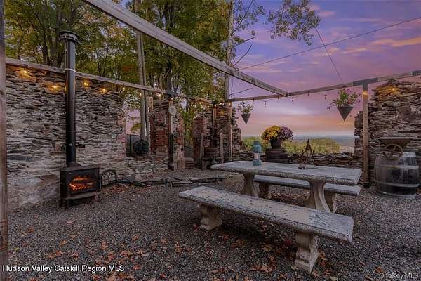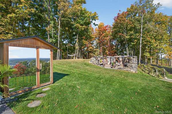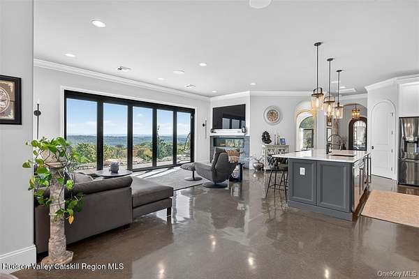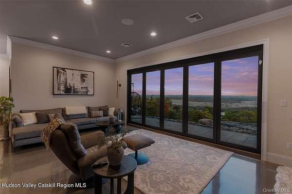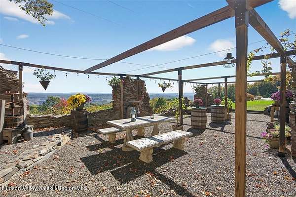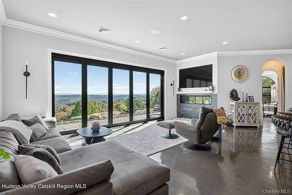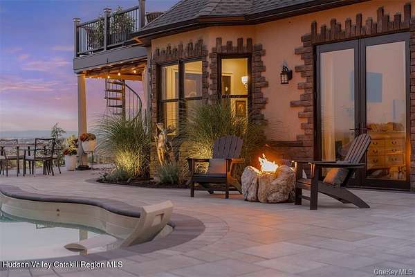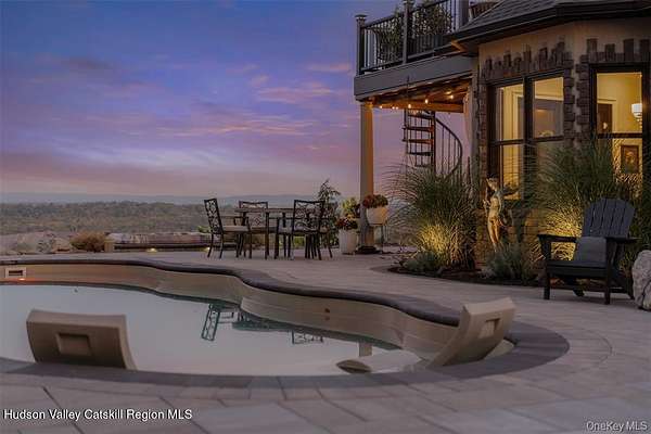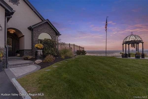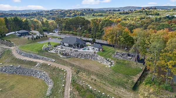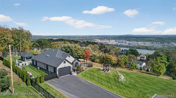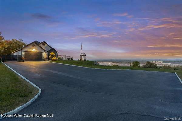 Perched on a hilltop with sweeping views of the Hudson River, this custom-designed and built single-level residence captures the essence of modern luxury living. With dramatic finishes, clean architectural lines, and every detail meticulously curated, the home was thoughtfully crafted for both comfort and entertaining. Step through a custom front door into a striking foyer that flows seamlessly into the sun-drenched chef's kitchen, outfitted with Quartz countertops, bespoke cabinetry, an oversized island, pot filler, gas range, wine refrigerator, and abundant workspace for culinary enthusiasts. The open layout continues into a light-filled dining area and expansive living room with floor-to-ceiling accordion glass doors that disappear to reveal breathtaking east-facing sunrises and uninterrupted river views. The exterior is an entertainer's dream, spanning 3.9 acres of lush, landscaped grounds. Enjoy a resort-style inground pool with water features and slide, a stacked-stone outdoor bar with changing room and bath, a custom-built fireplace, outdoor shower, hot tub, and sauna. A secret garden retreat with its own fireplace and starlit patio offers an intimate escape, while additional highlights include a playground, vineyard with grapevines and fruit trees, detached barn, and beautifully hand-stacked stone walls. Multiple terraces, a Juliet spiral staircase with balcony, and a covered porch complete the extraordinary outdoor setting. Inside, a spacious bedroom shares a full bath with tub and shower, while the luxurious primary suite offers private exterior access, a spa-inspired bath with double vanity and rainfall shower, and a generous walk-in closet. A two-car garage provides ample space for vehicles and storage, with a walk-up partially finished attic ideal for a den, office, or additional storage. Privately gated with abundant parking and surrounded by striking hardscaping, this Hudson River estate offers an unparalleled lifestyle of elegance, comfort, and connection to nature.
