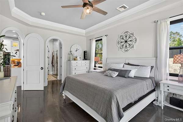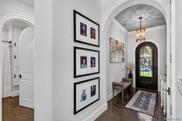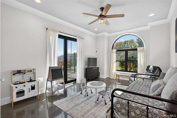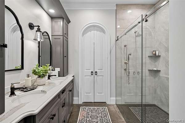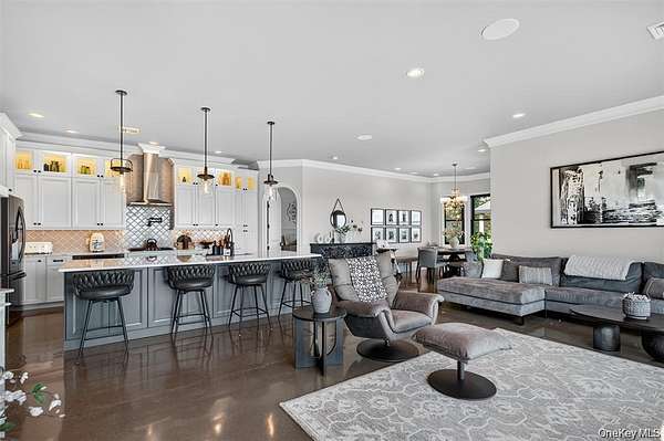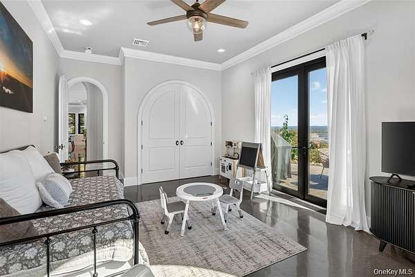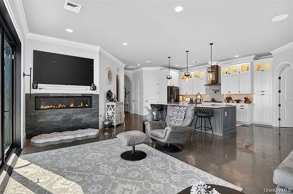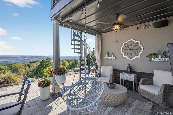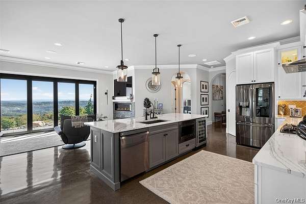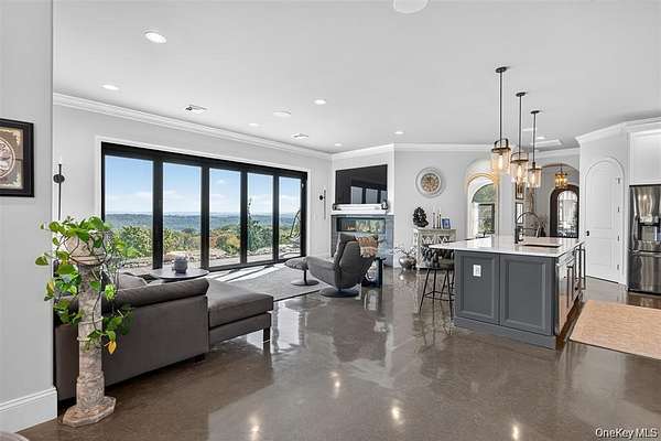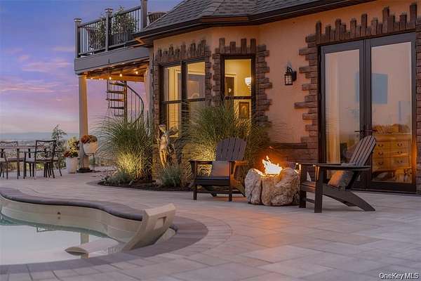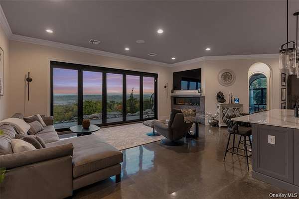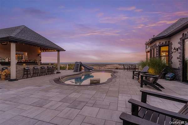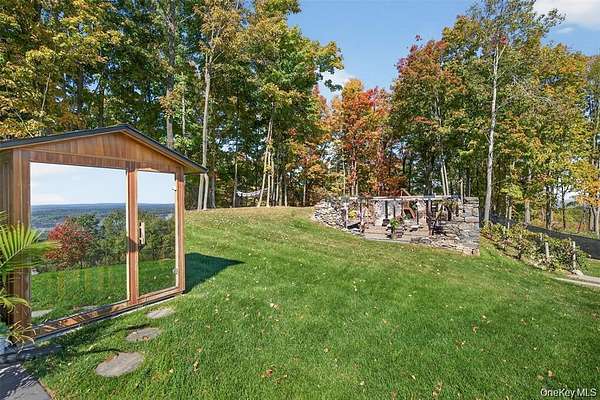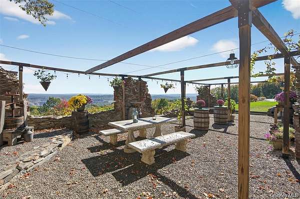 Perched high above the Hudson River with panoramic views set on 3.9 private acres, this custom-designed single-level estate embodies refined modern luxury. Clean architectural lines, dramatic finishes, and meticulously curated details create a residence that feels both sophisticated and effortlessly livable. The current layout lives spaciously, with the flexibility to easily convert to additional bedrooms, offering additional versatility without compromising the home's elegant flow. A custom entry door opens to a striking foyer that leads into a sun-drenched chef's kitchen designed for both everyday living and elevated entertaining. Quartz countertops, bespoke cabinetry, an oversized statement island, pot filler, gas range, wine refrigerator, and expansive prep space anchor the room. The open-concept design continues into a light-filled dining area and expansive living room, where floor-to-ceiling accordion glass doors fully disappear to reveal uninterrupted Hudson River views and breathtaking east-facing sunrises. The outdoor experience is nothing short of resort-like. Thoughtfully designed across lush landscaped grounds, the property features a stunning inground pool with water features and slide, a stacked-stone outdoor bar with changing room and bath, a custom-built fireplace, hot tub, sauna, and outdoor shower. A romantic secret garden retreat with its own fireplace and starlit patio offers a private sanctuary, while the grounds also include a playground, vineyard with grapevines and fruit trees, a detached barn, and beautifully hand-laid stone walls that weave throughout the property. Multiple terraces, a covered porch, and a Juliet spiral staircase with balcony create countless vantage points to take in the landscape and river beyond. Inside, a spacious guest bedroom shares a beautifully appointed full bath, while the luxurious primary suite serves as a serene retreat with private exterior access, a spa-inspired bath with double vanity and rainfall shower, and an expansive walk-in closet. A two-car garage provides ample space for vehicles and storage, while a walk-up partially finished attic offers the opportunity for a den, office, or additional living space. Privately gated with extensive hardscaping and generous parking, this extraordinary Hudson River estate delivers a rare combination of architectural beauty, privacy, and lifestyle, with the added opportunity to easily convert to a three-bedroom configuration for those seeking additional space.