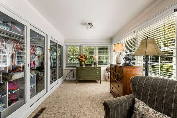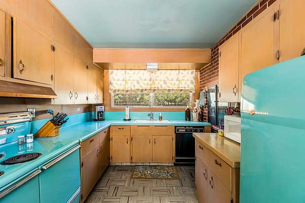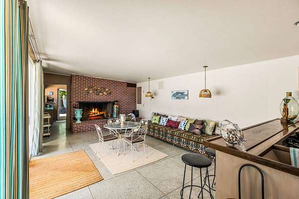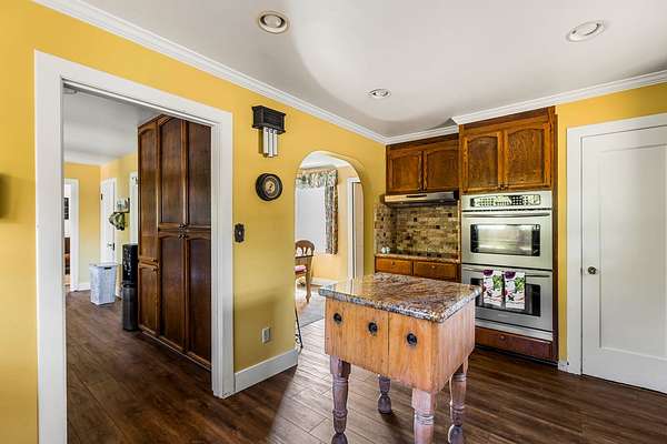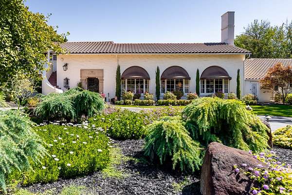 Nestled amongst a well-landscaped garden, trees, and paved plaza, the Spanish Colonial-style home features 4,628 sq. ft. of living space, boasting six bedrooms and four bathrooms. All bedrooms are spacious and well-laid out. Natural light pours into the entirety of the home through oversized windows and skylights. The living room embodies a comfortable country ambiance with exposed wooden beams and a high ceiling. Off the living room through sliding glass doors is a brick-laden patio with a large lawn. Nearby the kitchen, the dining room features a wood coffered ceiling with a terracotta tile floor, reflecting its Spanish Colonial style. The kitchen features a wooden butcher island block, stainless steel appliances, and windows overlooking the green garden.