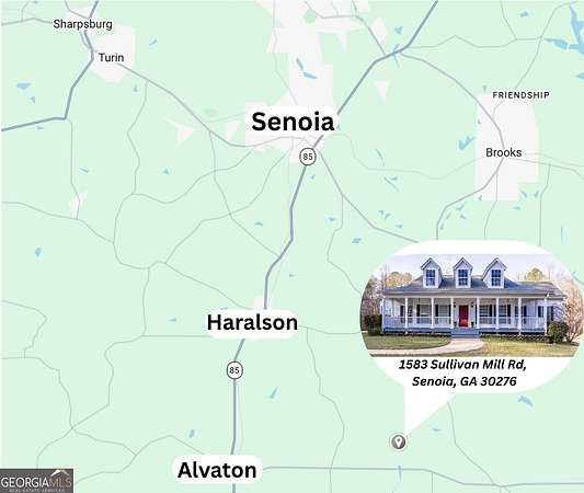 Some GPS maps end up 1/4 down the rd - look for 1583 mailbox / Coldwell Banker real estate sign - From Haralson on GA-85 - Follow Line Creek Rd - Turn Right on Mt. Carmel Rd - Follow Mt Carmel, Turn Left on Sullivan Mill rd - Follow to 1583 Sullivan Mill Rd, Senoia, GA 30276