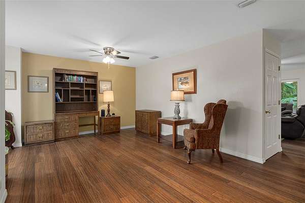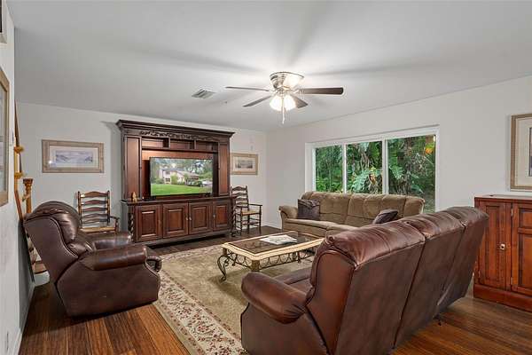 Find your serenity here on 5.66 acres of country paradise, conveniently close to dining, shopping, and entertainment available in North Tampa. You are nestled among the large oaks, lovely landscaping, and a stream running through the wooded area. No HOA/CDD, the lot is subdividable for a family compound. You will appreciate the large windows and gleaming Bamboo flooring as you enter the living room. The Great Room is located at the rear of this home with a view of the best country living in Florida. The Gourmet kitchen offers stainless steel appliances, newer cabinets, and granite countertops. French doors from the dining area lead to a covered screen porch with scenic views of your own park-like setting. Enjoy a scenic stroll for a break from your day, and enjoy the birds singing from the trees. Upstairs is the 14x16 main bedroom with an ensuite bath. Bedrooms 2 and 3 are also on the second floor and share the second bathroom. This home is built to last with METAL FRAMING, including the roof trusses and the first-floor trusses between 1st and 2nd stories. Experience lower. Energy bills. With solar panels installed. 2025. The majority of Windows were replaced in 2025. A newer AC was installed in October 2023. It is a RUUD 4-ton 15.2 SEER high-efficiency system. The water heater is from 2016 and has had the heating elements replaced., New roof Feb 2023 GAF Architectural Shingles and Resisto Peel and Stick (Secondary water barrier), Spacious two-car garage. That is plumbed for an alternate washer and dryer area. Spacious, well-equipped detached garage/workshop 30x40 and 15' tall, this garage was built for heavy equipment with room for your RV and extra toys/vehicles. Two 220 outlets and airlines throughout the building with 3 air compressor hook-ups, water available, a roll-up door 14' high, and a heavy-duty car lift. A paved driveway is a bonus for this property. Enjoy scenic strolls, bird watching, and the tranquility of country living with no neighbors in sight. Make this exceptional 5.66-acre property your new home today.