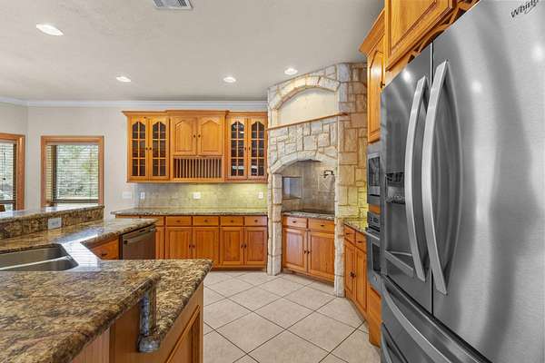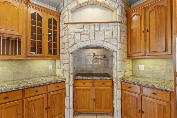 - Blinds/Shades, Bookcase, Breakfast Bar, Built-In Oven, Carpeting, Ceiling Fan(s), Convection Oven, Cook Top, Desks, Garbage Disposal, Granite Counter Tops, Ice Maker Conn., Inside Utility Room, Island Work Center, Pantry, Primary Bedroom Down, SLD Surface Countertops, Sheetrock, Smoke Alarm, Tile Floors, Vent Fan, Wet Bar, Wood Floors