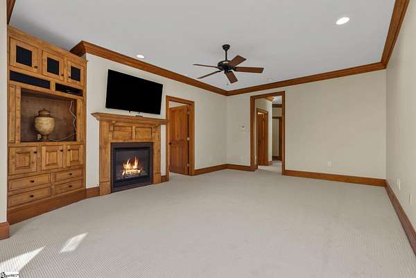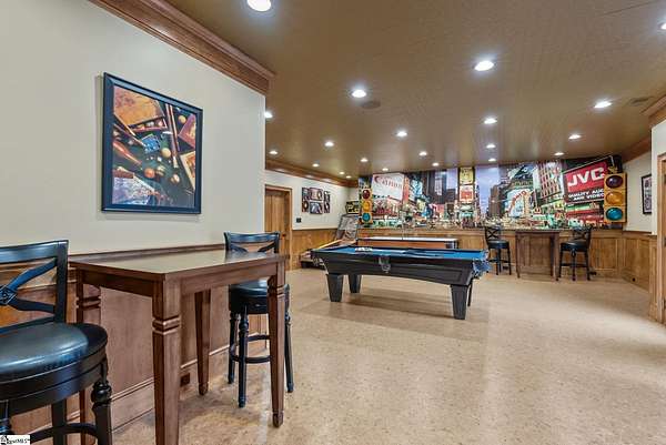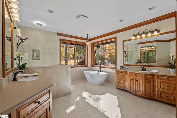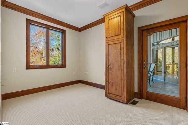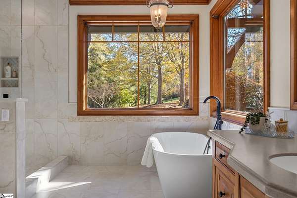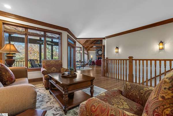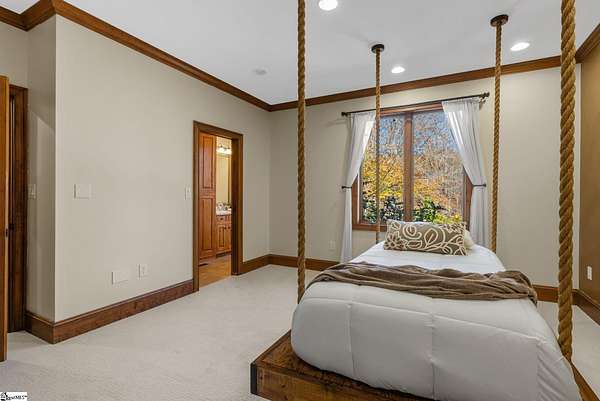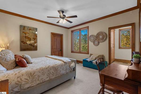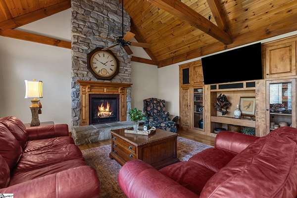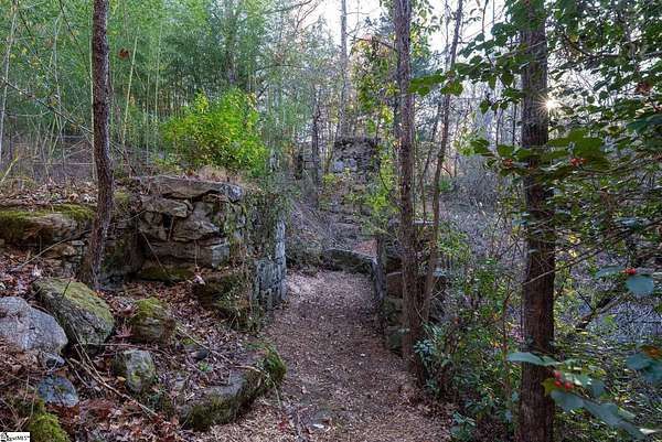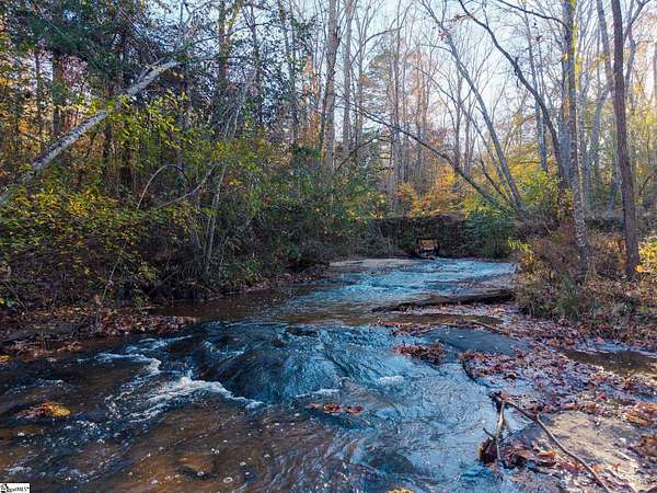 Once in a generation, a private estate emerges where history, craftsmanship, and natural beauty converge--159 Burdine Creek is exactly that. Set on 6.2 acres of wooded trails, open pasture, a natural rock waterfall, a flowing creek, and a clear swimming hole, this extraordinary property offers rare seclusion and modern comfort. Call Cindy Fox Miller & Associates at (864) 269-7000 to schedule your private tour! The centerpiece is a 5,900+ SF architect-designed European residence accompanied by 1790s mill-site stone walls, meandering wood-chip paths, a self-cleaning in-ground pool, and over 3,100 SF of garage/storage space. Thoughtful engineering, with geothermal heating/cooling and a secondary biomass boiler, ensures exceptionally low costs. A long private drive leads into the estate, opening to a circular drive and a striking facade with ornate gables, dormers, copper awnings, stone walls, rustic shutters, and a brick walkway to the grand entrance. Inside, the main level showcases rich artistry with hardwood floors, solid pine columns, wood ceiling beams, wrought iron lighting, and limewash walls that frame the light-filled formal sitting/dining rooms. The home then leads to a huge great room with a cathedral tongue-and-groove ceiling and anchored by a warm stone fireplace, built-in solid wood cabinetry, and exposed beams that give the space its refined character.The kitchen blends European elegance with modern function, offering solid-wood cabinetry, glass-door accents, ivory tile flooring, light granite countertops, a corner pantry, a full butler's pantry and so much more. Bar seats and a bright breakfast area overlook the heated pool, with access to a stunning screened porch. In a private wing, the primary suite is pure serenity with brand-new cream carpeting, a wood-surround fireplace, built-in TV cabinet, and tranquil views where the sound of the waterfall carries through open windows. A private attached office studio/nursery opens to the screened porch, while 2 walk-in closets house endless storage. The renovated 2025 primary bath feels like a luxury spa with 2 oversized custom wood vanities, ivory marble tile across floors/walls, a massive double-head shower with stunning mosaic accents, and a soaking tub framed by large corner windows overlooking the wooded landscape. This wing also has an impressive executive office or library enveloped in floor-to-ceiling bookcases, a warm fireplace and lots of sun. On the opposite wing lay 2 bedroom suites, each with an attached study space and renovated en-suite baths, creating comfort and privacy for guests. Downstairs, the 1,900+ SF basement lives like its own residence, with a living room, kitchenette with sink and refrigerator (wired for a stove), a full bath, and a huge game room that could easily convert into 4th/5th bedrooms. This level has over 600+ SF of unfinished storage, a 200+ SF utility/pool room, and an impressive 1,300+ SF oversized garage workshop/gym with its own driveway, plus an additional 900+ SF 2-car garage on the main level.Outdoors, the estate transforms into a getaway retreat. The in-ground pool, updated in 2025, sparkles in an expansive concrete terrace and a brick wood-burning fireplace with peaceful views to the creek. No neighboring homes are visible--only herons, deer, and wild turkey. Burdine Creek flows along 2 sides of the land at a rate of 1.4 million gal/day, feeding the waterfall/swimming area. Trails wind through woods and pass the 1790's mill-site ruins. Approx 1.2 acres of pasture house RV storage with 50-amp service and a creek-fed pump system for gardening/irrigation. Engineered as a "100-year home," the site features spray-foam insulation, extra-wide attic beams for full access, stone construction, and a Water Furnace geothermal system replaced in 2018. Despite its profound privacy, the estate is located 10 min from Hwy 123 & Downtown Easley, under 30 min to Downtown Greenville, and 30 min to Clemson.