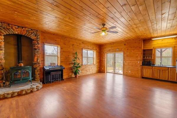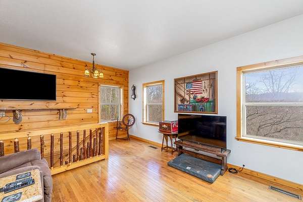 Please no drive-bys. At the end of a private road, where the woods open to long-range views, this custom-built cabin rests on 7.23 unrestricted acres with 180-degree, year-round mountain scenery. Built in 2000 with live-edge siding, the home rises with tall ceilings on both levels, giving it a lodge-like feel filled with shifting light from sunrise through sunset, thanks to its southern exposure. The main level offers three generous bedrooms and two baths, including a primary ensuite with a newer walk-in shower. Downstairs, the walk-out basement takes on a life of its own with a full kitchen, fourth sleeping quarters, and space suited for extended stays, with a wood stove adding warmth and character. A workshop and one-car garage add function to the setting. The land is open and full of possibilities, with multiple build sites for a family compound, homestead, or simply room to roam. Wildlife moves freely here, and the quiet runs deep. An assumable 2.99% mortgage makes this mountain home even more compelling.