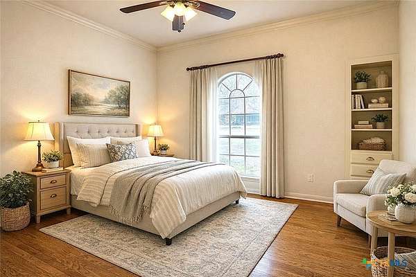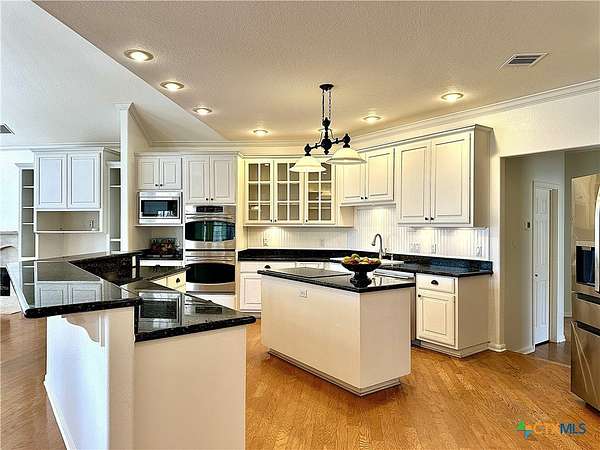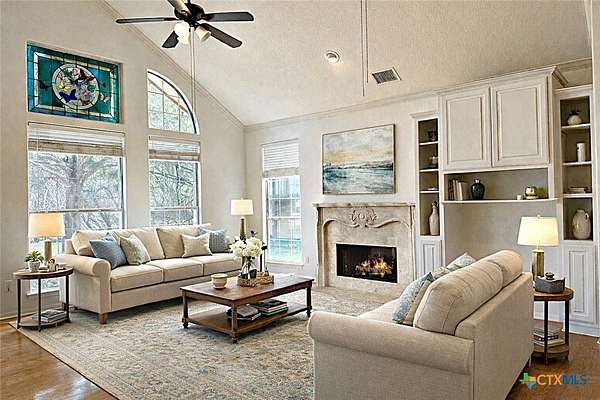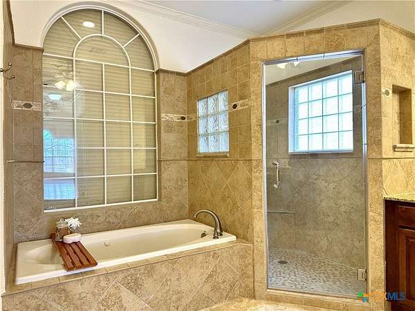 - All Bedrooms Down, Bookcases, Built In Features, Cathedral Ceilings, Ceiling Fans, Crown Molding, Dining Area, Double Vanity, Entrance Foyer, High Ceilings, His And Hers Closets, Home Office, Jetted Tub, Main Level Primary, Multiple Closets, Multiple Dining Areas, Open Floorplan, Primary Downstairs, Recessed Lighting, Separate Formal Dining Room, Stone Counters