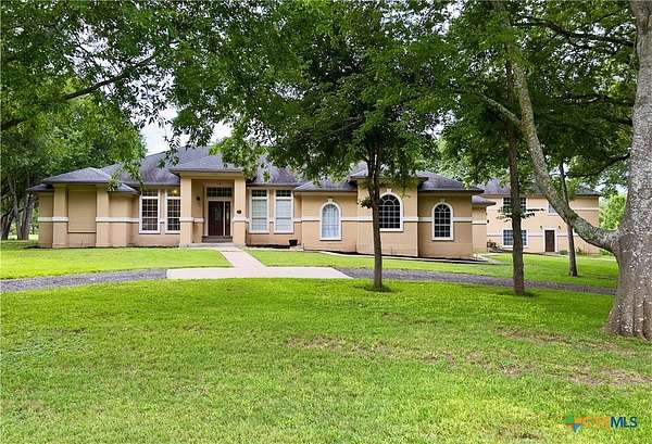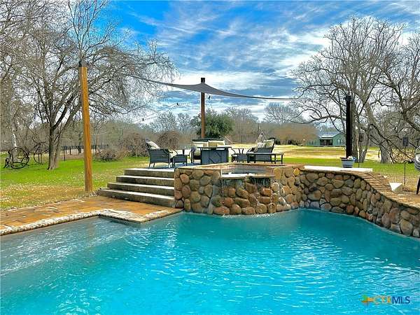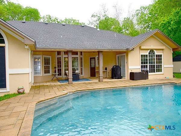 Exceptional estate property in Tahitian Village offering a thoughtfully designed main residence, fully equipped guest house, and resort-style outdoor living on approximately 1.52 acres. The main home features 4 bedrooms, 3 full bathrooms, a dedicated office, and a versatile flex space suitable for a formal dining room or additional sitting area. The interior has been recently repainted and is move-in ready with a fresh, neutral palette. The multi-level floor plan provides generous living areas, well-proportioned bedrooms, and seamless flow for both everyday living and entertaining. A unique design feature includes direct exterior access from the third bathroom to the pool and patio area - ideal for convenient indoor/outdoor use. The detached guest house offers exceptional flexibility with a full kitchen, dining area, living room, laundry, and primary suite on the main level. Upstairs includes two additional bedrooms connected by a Jack-and-Jill bathroom, plus a secondary living area. This configuration allows for extended guest accommodations, multi-generational living, or private retreat space. Outdoor amenities are designed for relaxation and entertaining, highlighted by a private pool and spa with a waterfall edge feature. The surrounding patio area provides ample space for gatherings and outdoor enjoyment. Located in Bastrop's Tahitian Village community with convenient access to local amenities, golf, and major commuter routes. Buyer to verify square footage.