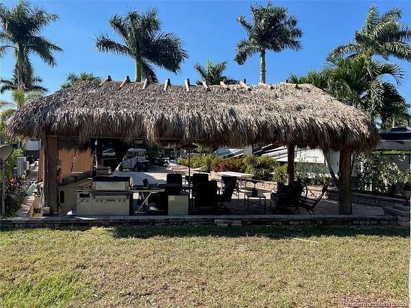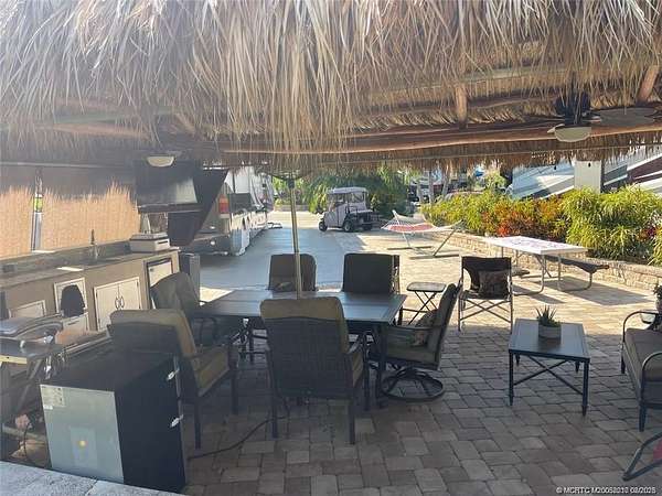 This spacious 3,335 sq. ft. lot offers the perfect blend of privacy and resort-style living, backing onto the wall for a quiet, secluded setting. The expansive tiki hut is ideal for entertaining, with ample space for large gatherings, two ceiling fans, a mounted TV, and comfortable furnishings. The custom outdoor kitchen features granite countertops with plenty of prep and serving space, making it as functional as it is stylish. Additional highlights include a newly re-thatched tiki roof (Sept. 2022), lush mature landscaping, decorative paver walls, and a beautifully finished pad with custom paint. Move-in ready and designed for both relaxation and entertainment-just bring your coach and start enjoying the ultimate RV lifestyle!