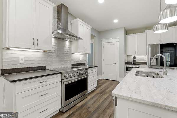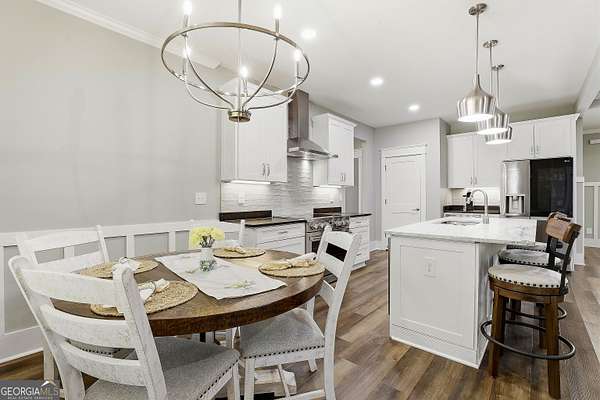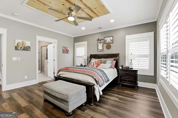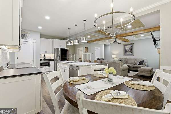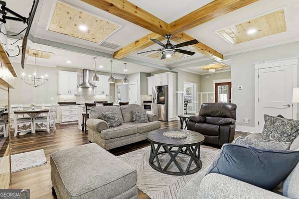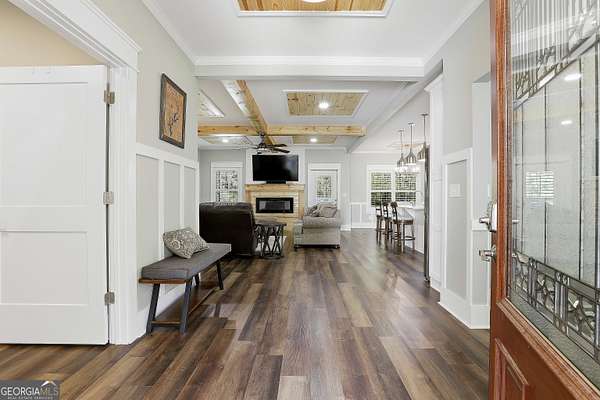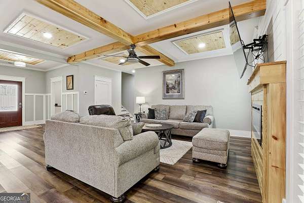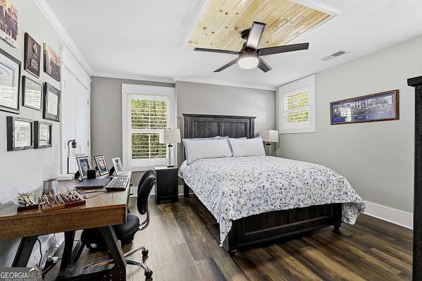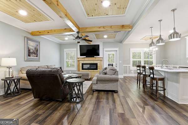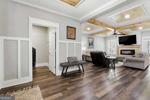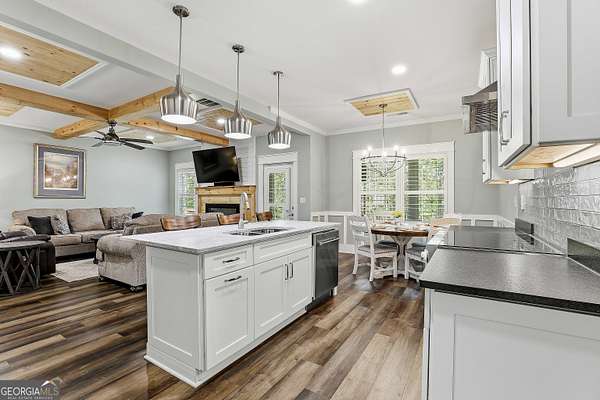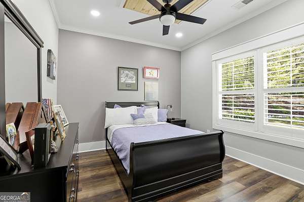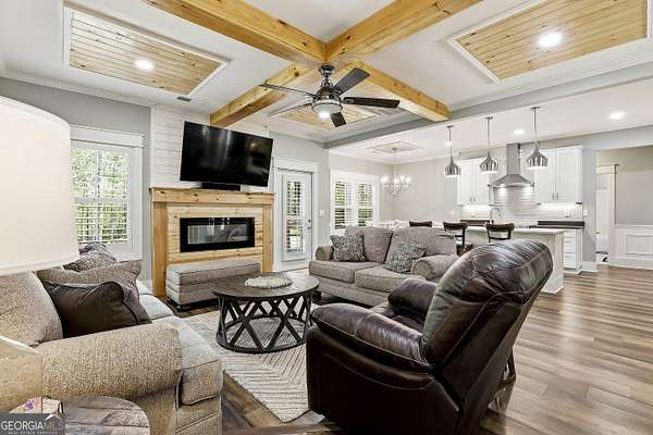 Welcome to The Lake Life. This Craftsman-style lake home offers a private, serene setting on West Point Lake, featuring 5 bedrooms and 3.5 bathrooms with a thoughtfully designed layout. The main level includes 3 bedrooms and 2.5 baths, while the upper level offers 2 additional bedrooms, a full bath, and a versatile loft space-ideal for guests or extended stays. Nestled within a gated neighborhood where residents enjoy peaceful walks and lake living, the property backs up to West Point Lake, providing added privacy and the rare ability to walk down and launch a kayak directly from your backyard. A deeded boat slip with water and power (Sundance Slip #6) is included and located just a short golf cart ride away, offering effortless access to the lake. Inside, the home showcases LVP flooring and ceramic tile throughout, complemented by neutral designer tones, plantation shutters, and elevated wood detailing. A flexible space off the entry serves beautifully as a formal dining room or private office, with a well-positioned laundry room for added convenience. The main living area is open and inviting, anchored by an electric fireplace and seamlessly connected to the kitchen. The kitchen is thoughtfully appointed with leathered granite countertops, a spacious island with seating, tile backsplash, stainless steel Thor appliances, a built-in drawer microwave, pantry, and a light-filled breakfast area. The primary suite on the main level offers a refined retreat with crown molding and a spa-like bath featuring shiplap accents, tile flooring, a tiled shower, garden tub, and a double vanity with quartz countertops. The split floor plan enhances privacy, with additional bedrooms tucked away in their own wing. Upstairs provides exceptional flexibility with two bedrooms, a full bath with double vanity, and a loft space-perfect for guests, a media room, or additional living space. Outdoor living is equally impressive, featuring a screened-in porch with tongue-and-groove ceilings and stone flooring, a welcoming front porch, a level fenced backyard, and a cozy fire pit area designed for relaxing evenings. Conveniently located approximately 53 miles from Hartsfield-Jackson Atlanta International Airport and just 7 miles from downtown LaGrange, this home offers the perfect balance of peaceful lake living and accessibility-ideal as a full-time residence or an elevated weekend retreat.