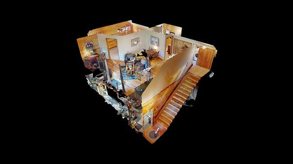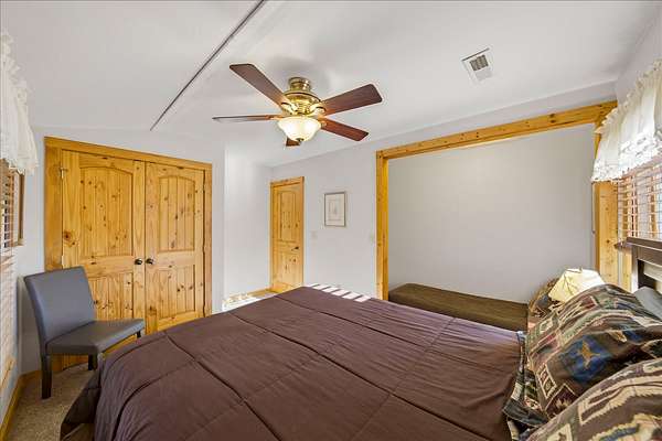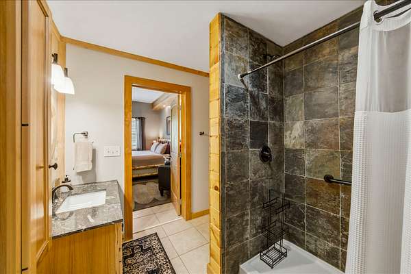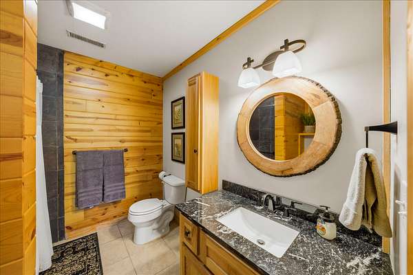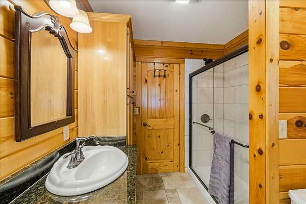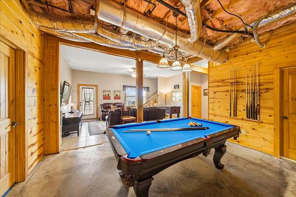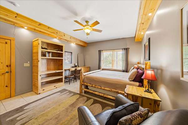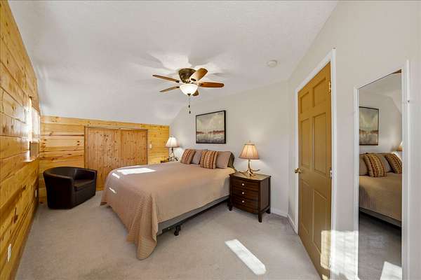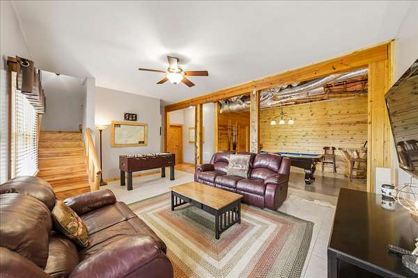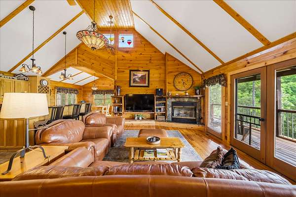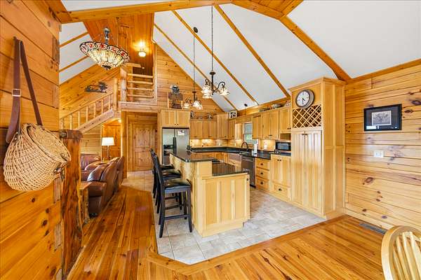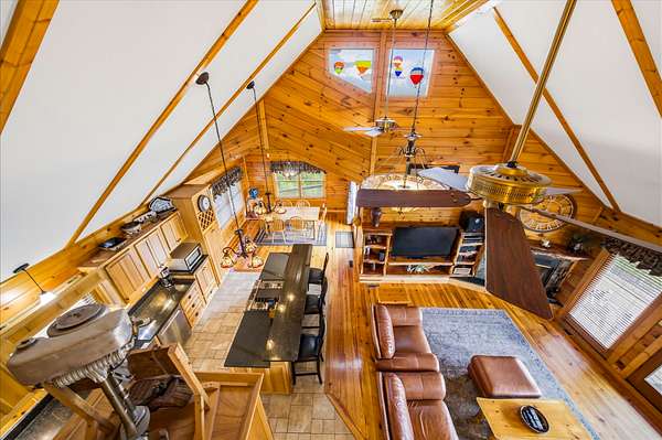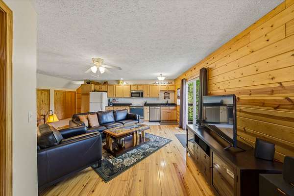 The main residence offers 3 bedrooms and 2 full bathrooms with an open floor plan, soaring vaulted ceilings, and abundant natural light. The spacious great room features warm wood finishes and a fireplace, creating a comfortable and inviting atmosphere. The kitchen is well-appointed with ample cabinetry and counter space, ideal for both everyday living and entertaining. There are two bedrooms on the second floor and in the finished lower level there is a den and game room that walks out onto the lower patio.