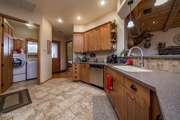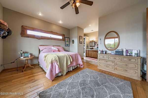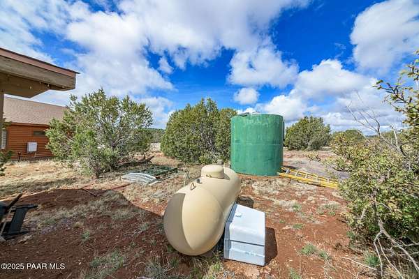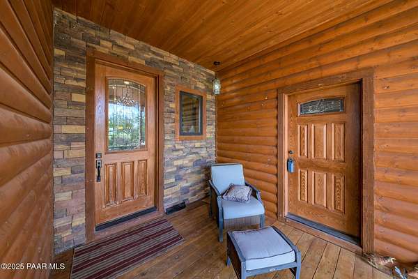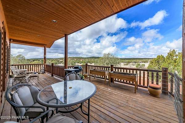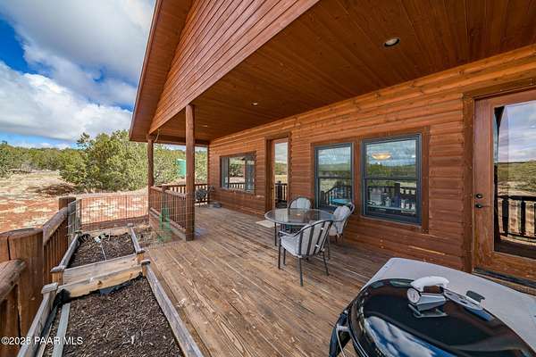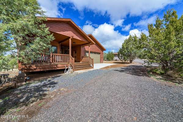 Discover this stunning custom-built home situated on 10 acres of picturesque land in Ashfork. The residence features exquisite solid oak wood floors, elegant porcelain tiles, and unique live edge window and door trim. Inside, you'll find vaulted log beams and tongue and groove ceilings, enhancing the rustic charm of this custom cabin. The thoughtfully designed split floor plan includes amenities such as air conditioning, a luxurious soaking tub, a pantry, and spacious covered decks at both the front and back of the home. Additionally, the property offers a separate studio/workshop with a loft, perfect for late-night projects, and a convenient storage shed. Come and experience this exceptional property for yourself!