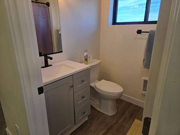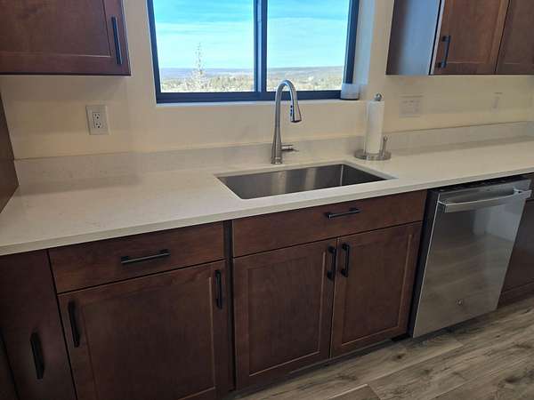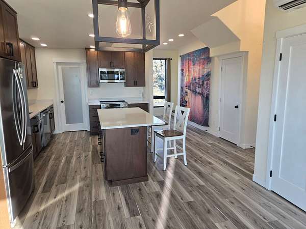 - Double Vanity, Enclosed Toilet(s), Kitchen Island, Open Floorplan, Pantry, Primary Downstairs, Shower/Tub Combo, Solid Surface Counters, Stone Counters, Walk-In Closet(s)