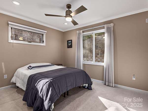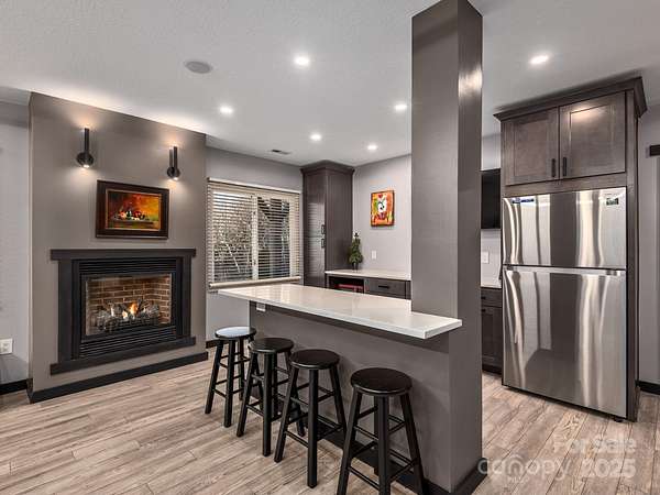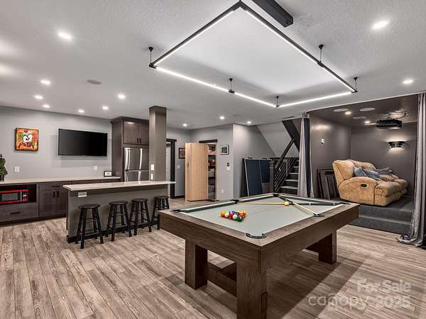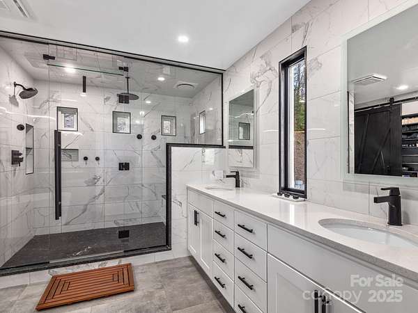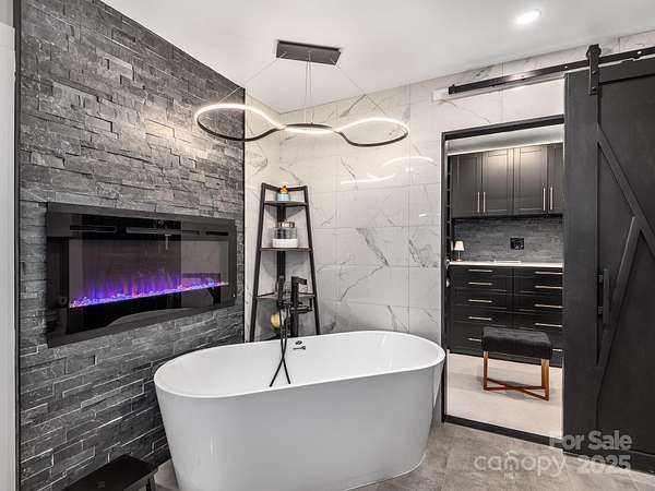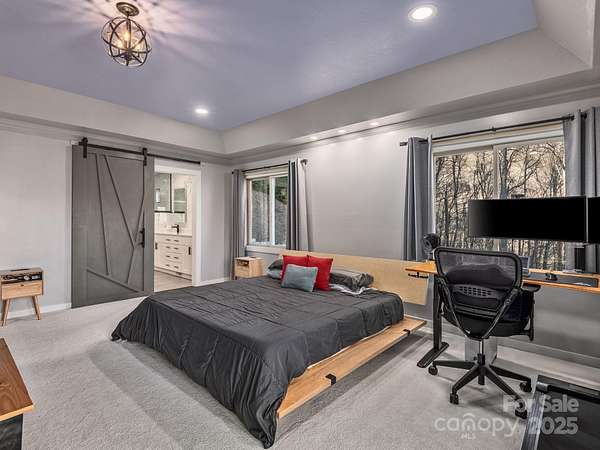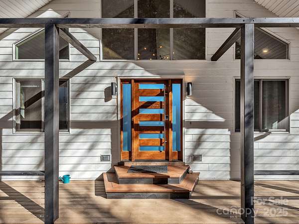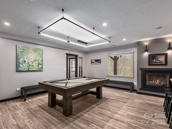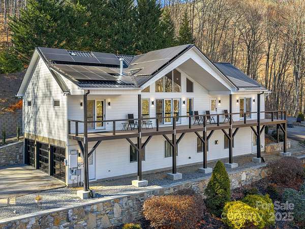 Welcome to 1591 Chestnut Flats, a private and elevated mountain retreat located just moments from Historic Main Street Waynesville. As you enter the premier gated community of Villages of Plott Creek, a mature forest and gentle creek lead you to an exclusive enclave featuring a private pond, waterfall, and a yoga platform overlooking the water. No expense was spared in constructing this energy-efficient home, which features geothermal heating and cooling alongside a whole-house generator. The main floor is an entertainer's paradise, boasting soaring glass windows with mountain views, a 17-foot kitchen island with custom cabinetry, and a separate wet bar. The primary suite is among the finest in Western North Carolina, offering fireplaces in both the bedroom and the bath, a massive custom tile shower, and a fully customized walk-in closet. The main level also includes two additional bedrooms, a full bath, a powder room, laundry facilities, and a private office. The lower level is designed for recreation, featuring a home theater, a second kitchen, a pool table, and a full bath. Additionally, the fitness center provides the perfect space to stay active before heading out to enjoy the trails located right outside your door.