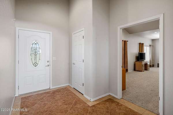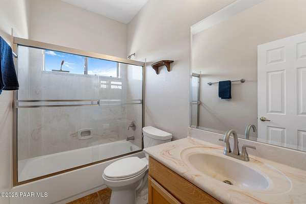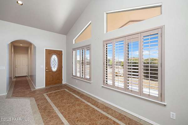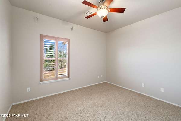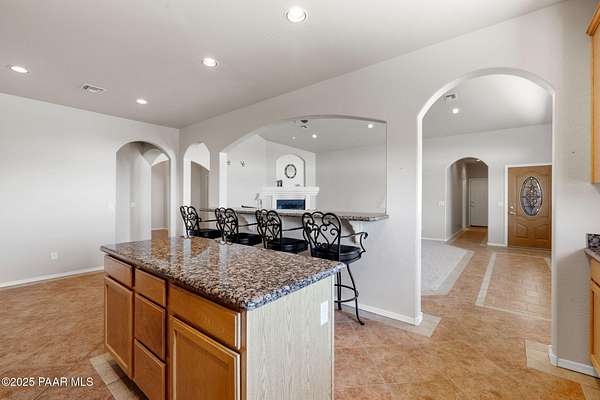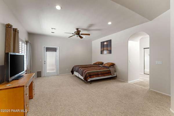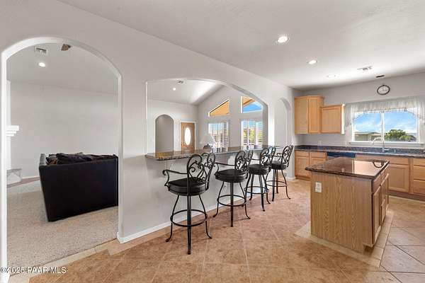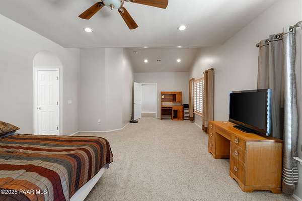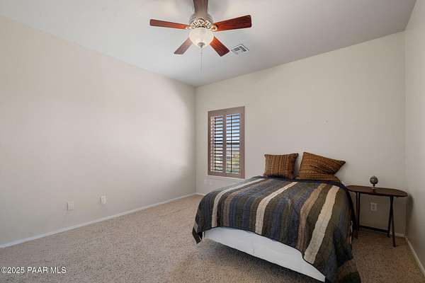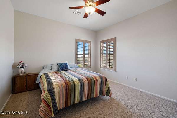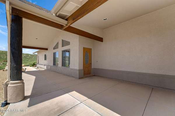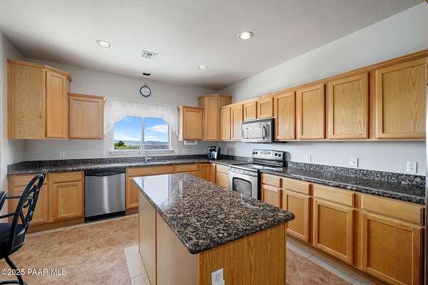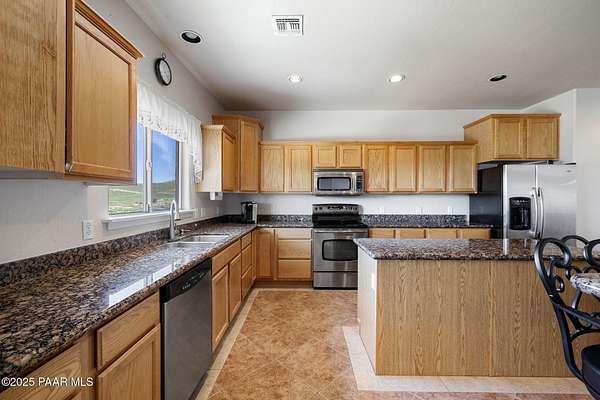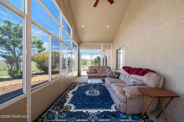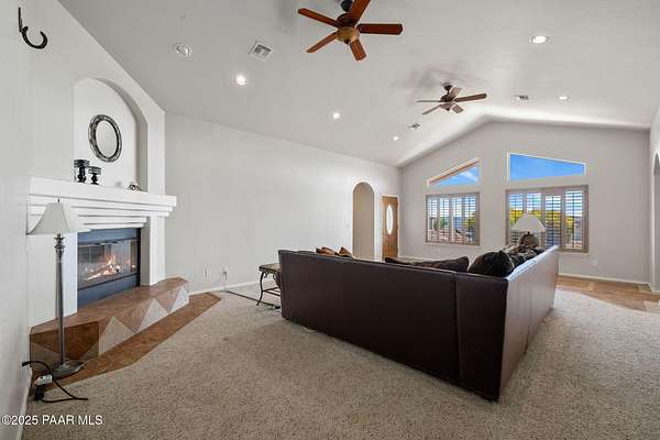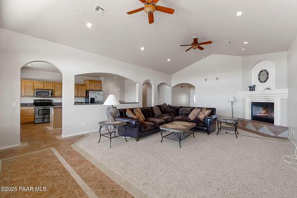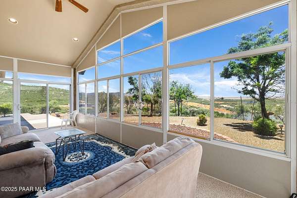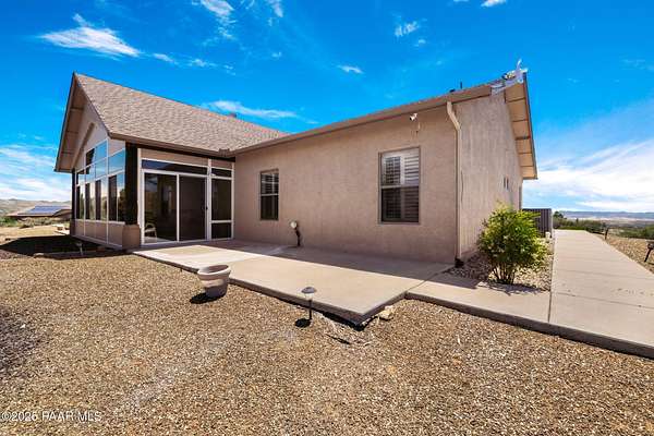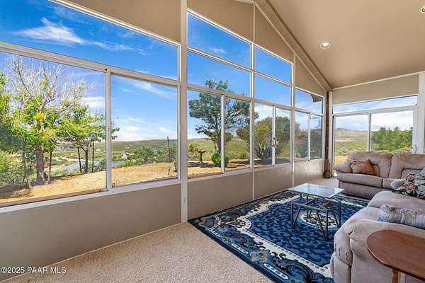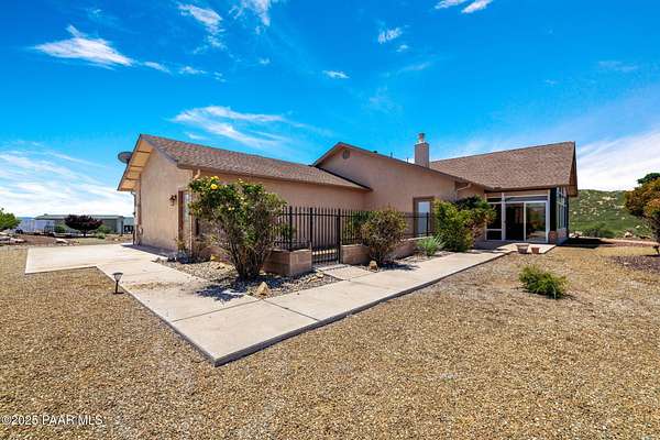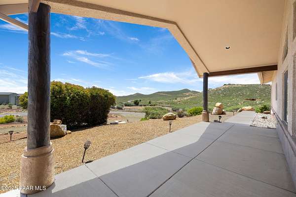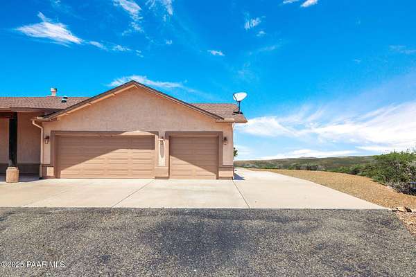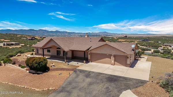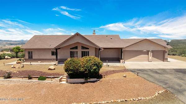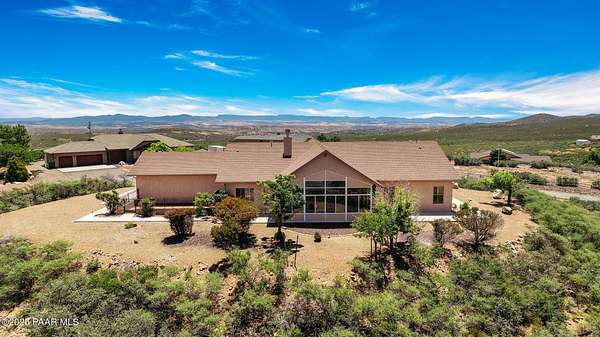 Perched atop a private 2.25-acre lot in Dewey, Arizona, this single-level, freshly painted hilltop home offers stunning 360-degree views, serene privacy, and a flat driveway for easy access. Features include a circular drive, RV parking, and a split floor plan with a spacious family room, vaulted ceilings, and a wood-burning fireplace. The gourmet kitchen boasts granite countertops and stainless appliances. The luxurious owner's suite features dual sinks and a walk-in closet. Enjoy year-round views from the enclosed Arizona room. A three-car garage and security cameras add convenience and security. Perfect for those seeking luxury and tranquility.