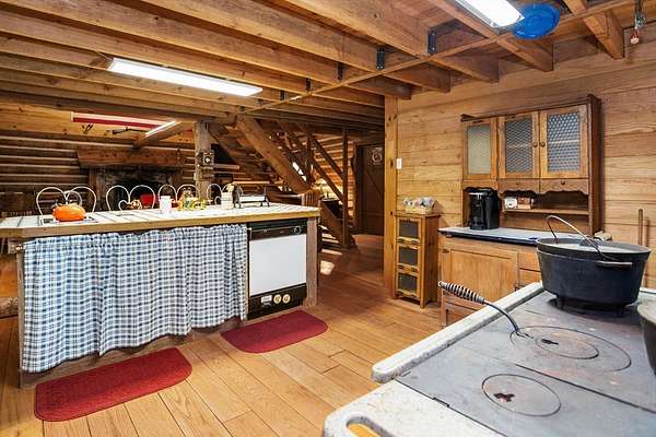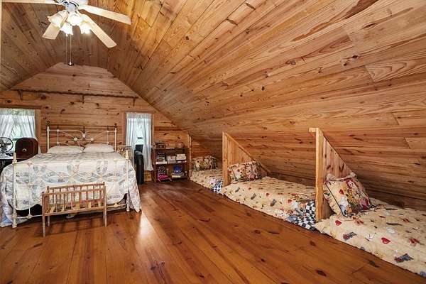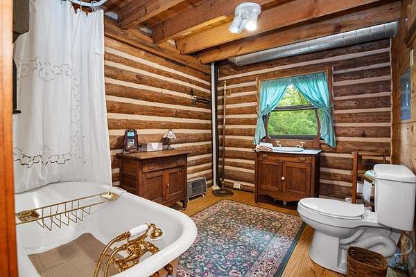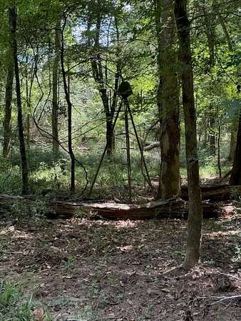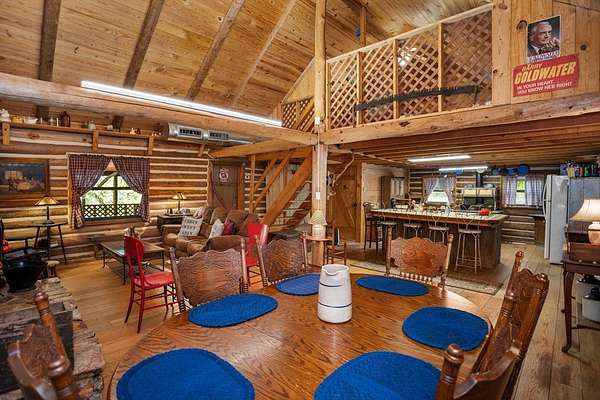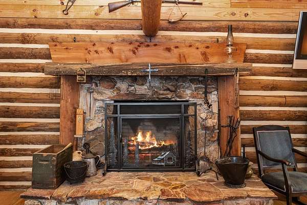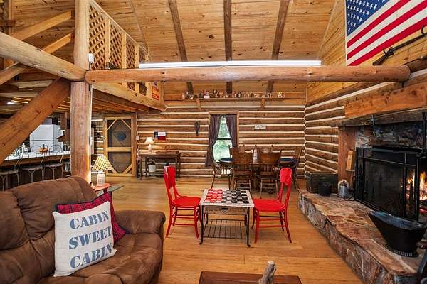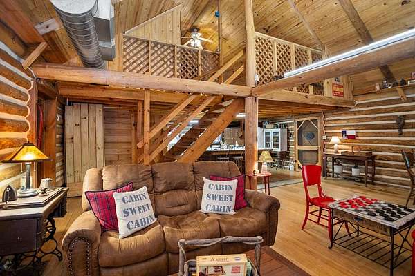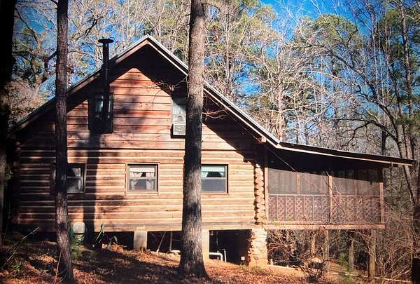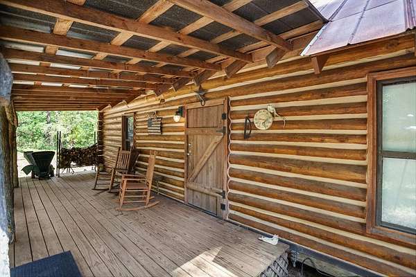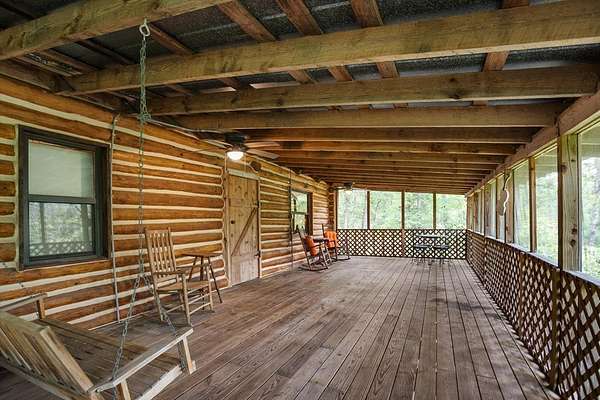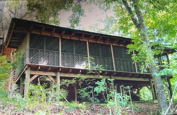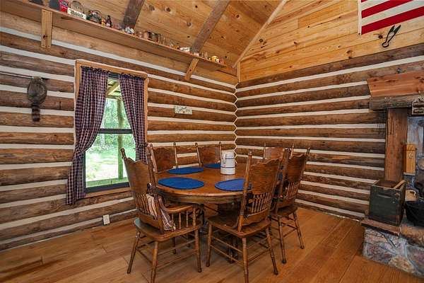 This property includes 56.35 acres with a hand-built log cabin and is perfect for hunting trips or peaceful weekend getaways! The unique cabin was built on-site with rough cut logs, where great attention to craftsmanship and detail were not overlooked. The solid built structure has a covered front porch with wooden oak columns leading into the vaulted living room and open concept kitchen. A large tile kitchen island is the focal point with a built-in sink, electric cooktop, and dishwasher. Keep warm during the winter and enjoy watching tv beside the wood burning fireplace with a large rustic mantle. The downstairs area includes a primary restroom with custom antique vanity and clawfoot tub. The upstairs loft comfortably sleeps five and has built-in space saving wall niche beds to accommodate guests, as well as a half bath. Enjoy nature on expansive screened-in rear porch which overlooks the heavy timber all the way down to the creek. There is no shortage of wildlife, either!