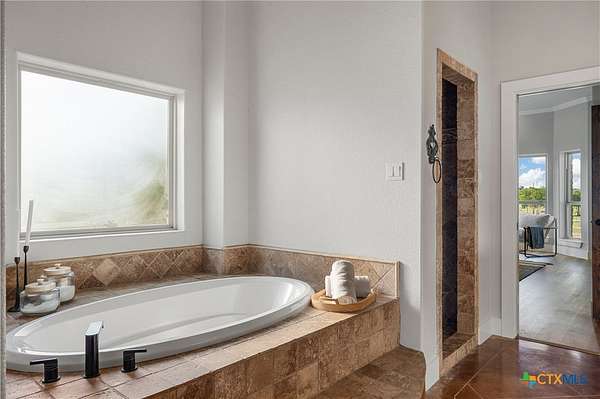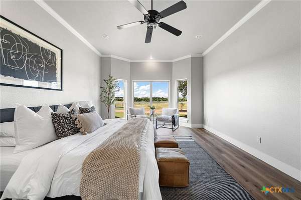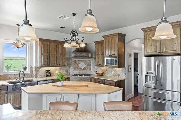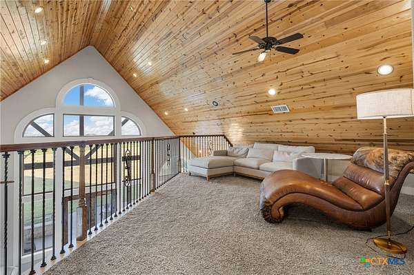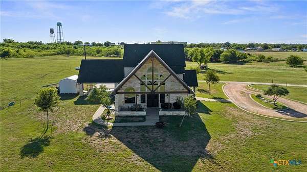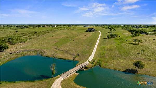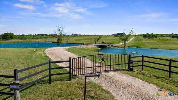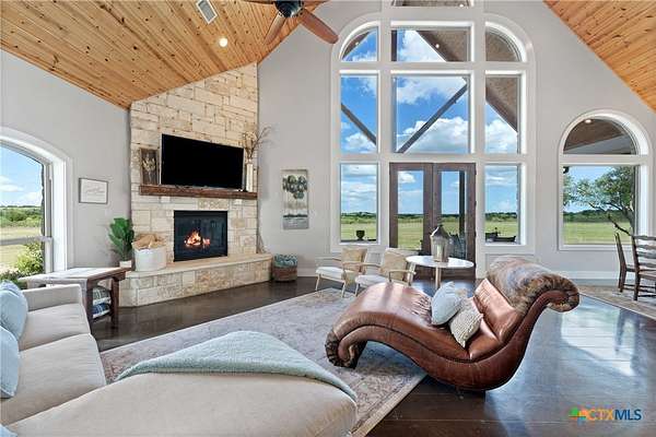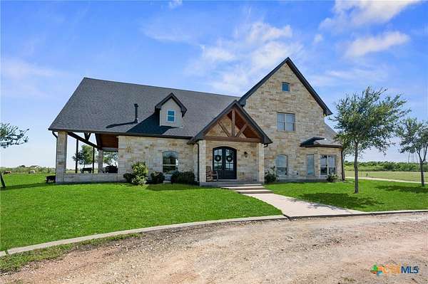 Beautifully designed 4,017 sq ft stone residence situated on 27.9 acres, complete with a one-acre tank and existing agricultural exemption. This thoughtfully constructed home offers four bedrooms plus a flex room, three full bathrooms, and one-half bath, providing versatile spaces to suit a variety of needs. The interior features custom wood cabinetry and solid wood doors throughout, along with built-in bookshelves and a media center. The kitchen is equipped with granite countertops, an oversized butcher block island, double ovens, a gas cooktop, hammered copper vent hood, farmhouse sink, coffee bar, and a spacious walk-in pantry-designed for both functionality and style. A loft area overlooks the great room, highlighted by 24-foot white pine vaulted ceilings and a striking wall of large windows that bring in abundant natural light. Additional interior features include a gas fireplace and double entry doors. Constructed with attention to quality and efficiency, the home includes a deep-pier foundation support system, full spray foam insulation, two propane tankless water heaters, and an 18-SEER zoned HVAC system. An eight-zone irrigation system services the grounds. The roof was replaced in 2025, and the interior has recently been refreshed with new paint. This property offers a blend of open acreage, modern systems, and carefully selected finishes, creating an opportunity for a variety of residential, recreational with an agricultural exemption in place