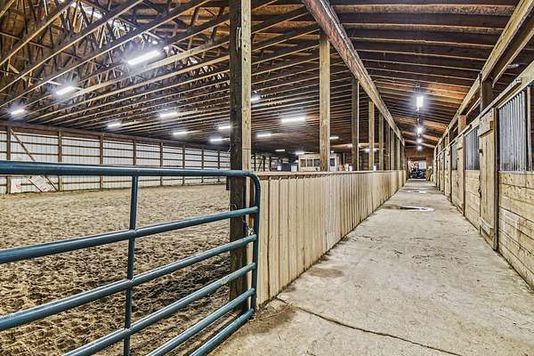 Welcome to Iron Horse Ranch! This stunning ranch home set on 16 private acres is a true dream for horse enthusiasts or anyone who loves the outdoors. The home's open and inviting design is filled with natural light and thoughtful details throughout. At the heart of the main floor is a spacious kitchen with views into the living area and out across the picturesque property. A large main-floor den offers space to work or create. The primary bedroom features private backyard views, a large bathroom, walk-in closet, and direct access to the porch. The main floor also offers three additional bedrooms and bathroom. The large mudroom connects the home to the heated garage that then leads into your equestrian barn. With 13 horse stalls, 60x132 indoor riding arena, viewing area and 100x150 outdoor arena. This equestrian facility has everything you need!
