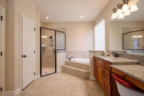 - Eat-In Kitchen, Open Floorplan, Solid Wood Cabinets, Split Bedroom, Stone Counters, Thermostat, Walk-In Closet(s)