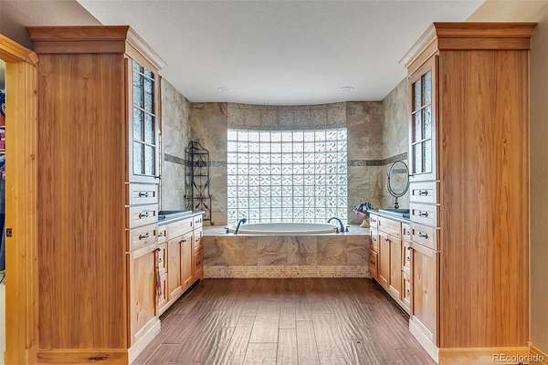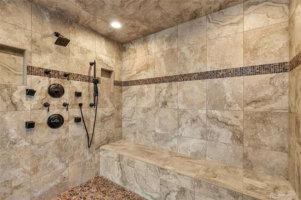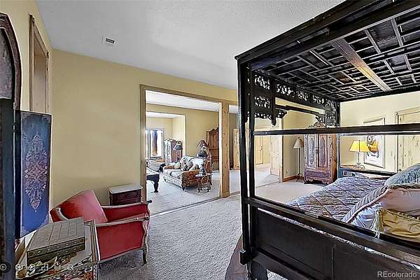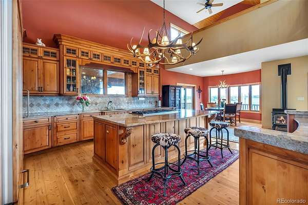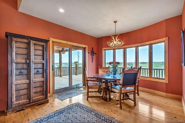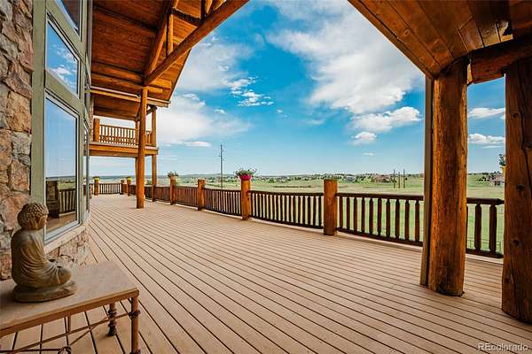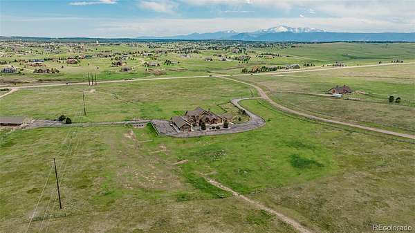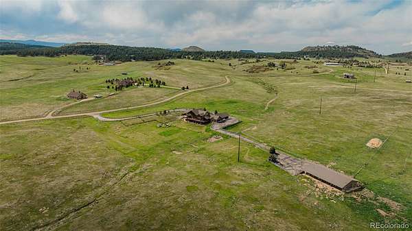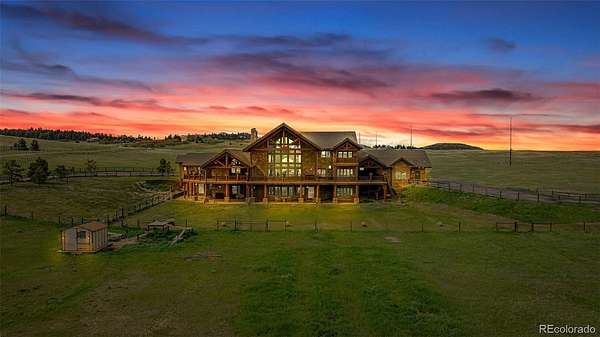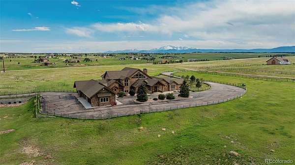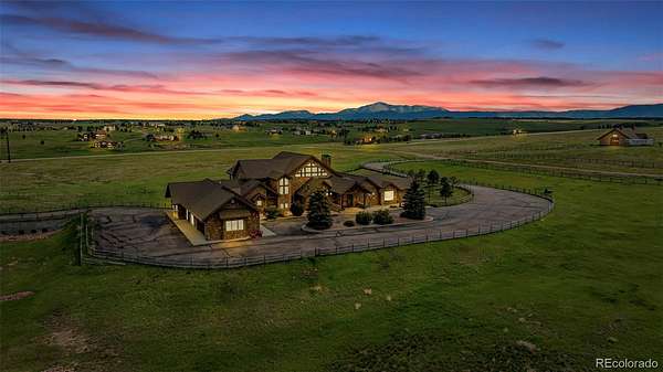 Set on 35 acres of pristine Colorado landscape, this exceptional ranch estate with a loft offers 4 bedrooms, 6 bathrooms, and an unmatched blend of privacy, luxury, and panoramic views of the valley and Pikes Peak. Every inch of this home reflects thoughtful design and timeless craftsmanship. The breathtaking great room features a 29-foot vaulted ceiling with exposed timber beams, a wall of windows that floods the space with natural light, rich hardwood flooring, elegant chandeliers, and a dramatic stone-wrapped fireplace. The gourmet kitchen is a chef’s dream with slab granite countertops, custom cabinetry, dual oversized islands—one with a gas cooktop and antler chandelier, the other with a prep sink and bar seating—plus a cozy breakfast nook and walk-in pantry. A formal dining room with vaulted wood ceilings and hardwood floors sets the stage for memorable gatherings. The main-level primary suite is a luxurious retreat with a fireplace, vaulted wood ceiling, and access to a wrap-around covered deck. The spa-inspired en-suite bath features a massive walk-in steam shower, soaking tub, dual vanities, and two walk-in closets—one with its own washer and dryer. Downstairs, the finished walk-out lower level includes a spacious family room with wet bar and fireplace, an authentic in-home theater, and two additional en-suite bedrooms. Outdoors, enjoy a fenced backyard, fenced pasture, and a 3,500+ sq ft barn with 3 stalls and 10 doors—perfect for horses or hobby livestock. This is Colorado living at its finest—where beauty, privacy, and sophistication converge. It’s more than a home—it’s a legacy. Conveniently located just 6 minutes from I-25! View the aerial tour here: sites.listvt.com/vd/192473071 and the Matterport tour here: my.matterport.com/show/?m=dZkrVBPyUiJ