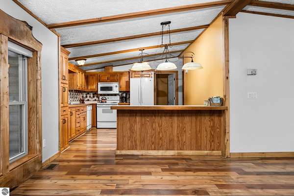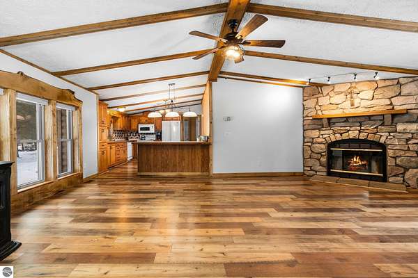 Step into easy main-floor living with this 3 bed/2 bath ranch-style log home, perfectly blending rustic character with modern comfort. The open layout is bright and inviting, featuring vaulted, beamed ceilings, and a wall of windows. A stone fireplace anchors the living and dining area, while the spacious kitchen shows off ample cabinetry, a striking hexagon tile backsplash, and a large dining peninsula that makes cooking, gathering, and entertaining a breeze. Two roomy guest bedrooms, a full bath, and a dedicated laundry are tucked down one hallway, while the private primary suite sits opposite for maximum retreat. Here you'll find a generous walk-in closet and an en suite bath with dual sinks, a shower built for two, and a soaking tub that begs you to unwind. A breezeway connects the home to an impressive 40x20 pole building and garage, ensuring you and your vehicles stay sheltered year-round, with extra room for all the toys. Nestled on nearly two wooded acres, this property offers the perfect mix of privacy, space, and warmth. Clean, move-in ready, and waiting for you to call it home.