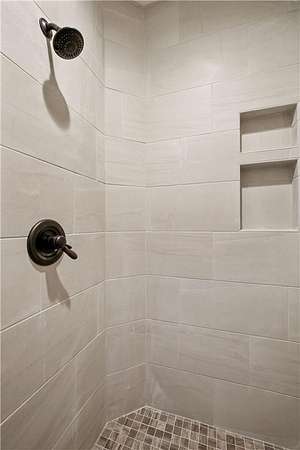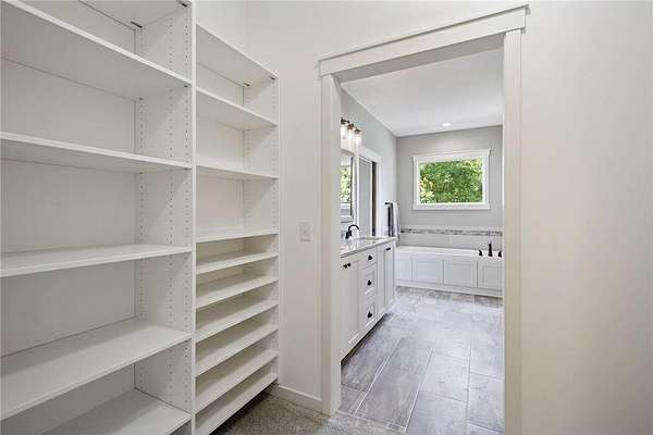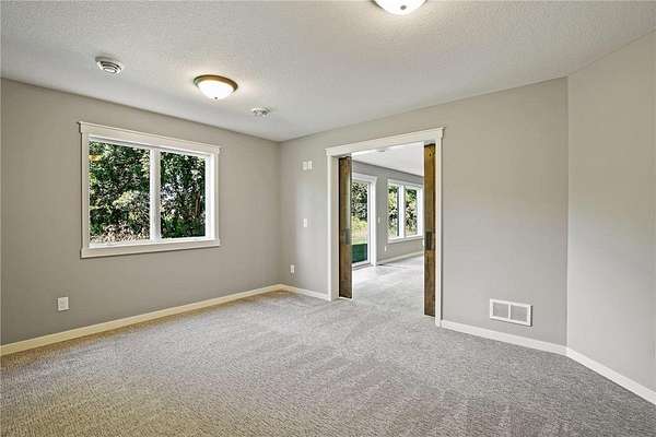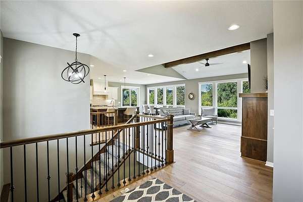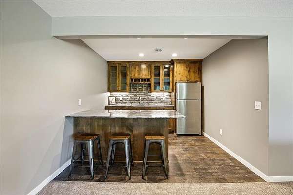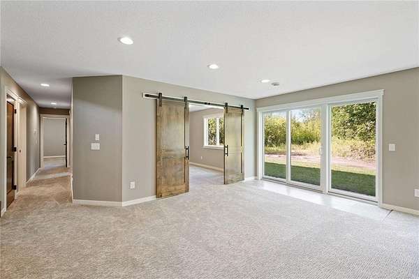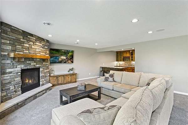 Downstairs, the finished lower level expands your living space with two more bedrooms, a full bath, a versatile flex room with barn doors, a custom wet bar, and a spacious family room anchored by a cornerstone fireplace and more built-in cabinetry.