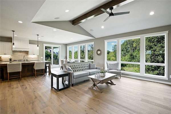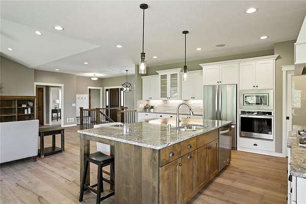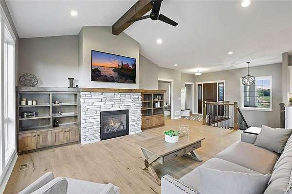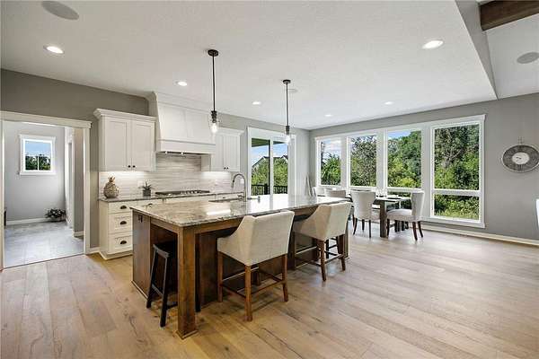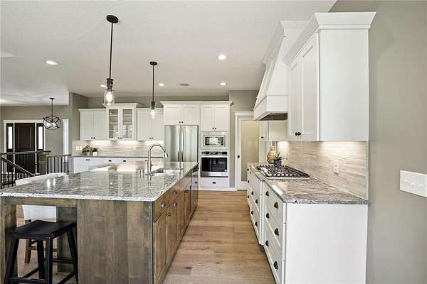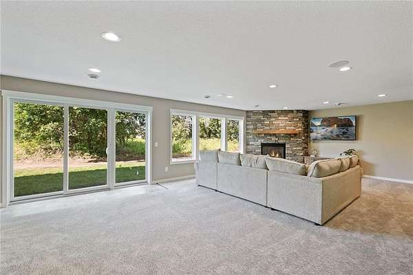 The open concept main level features a generous primary suite, a second bedroom with a walk-in closet, and a gourmet kitchen that flows into a vaulted great room. A striking stone fireplace and custom built-ins add warmth and character, while the adjacent dining area leads out to a fully covered, maintenance-free deck, ideal for enjoying Minnesota's changing seasons in comfort.