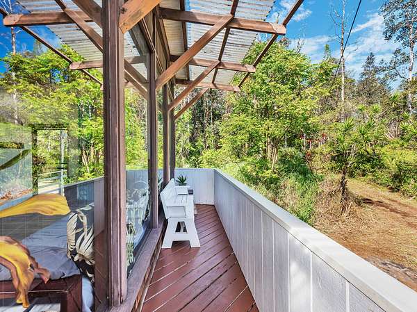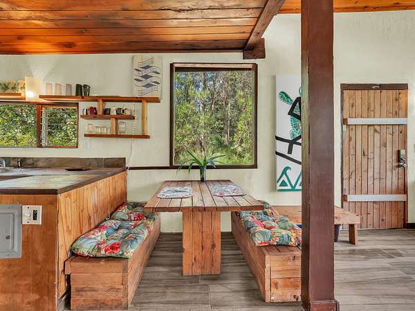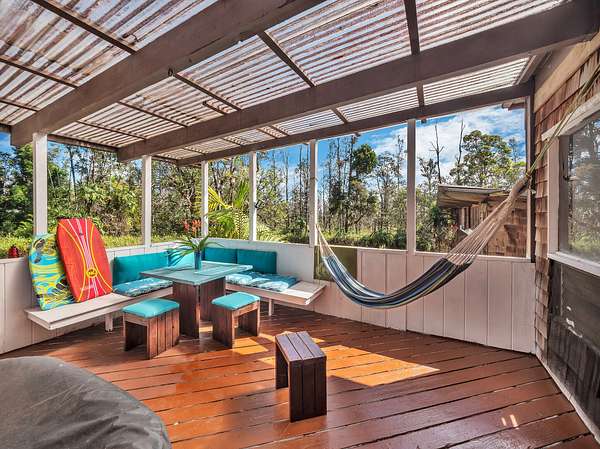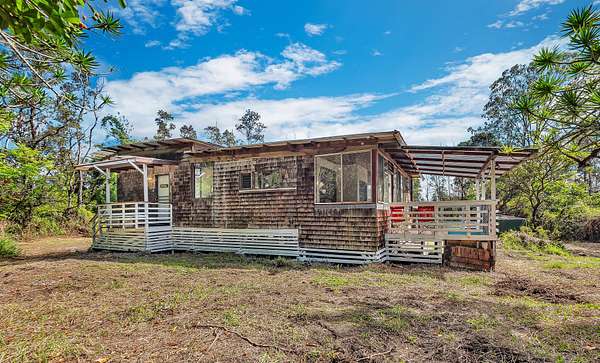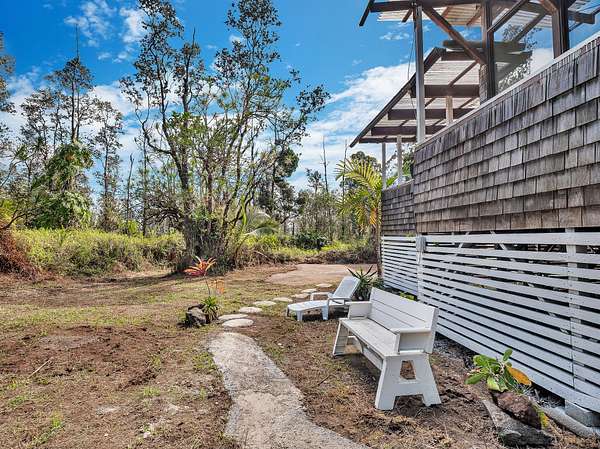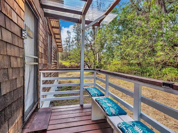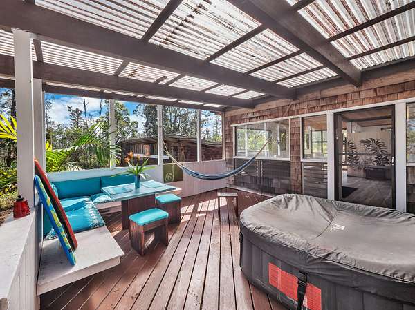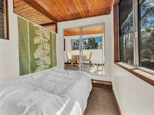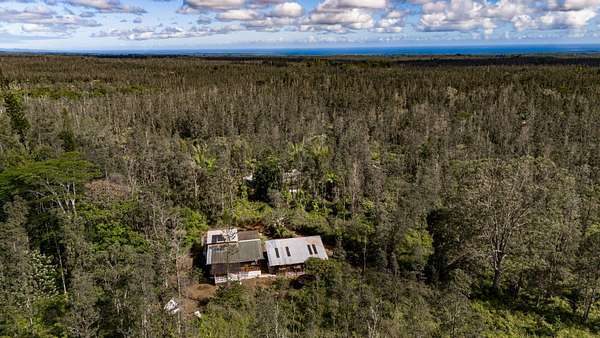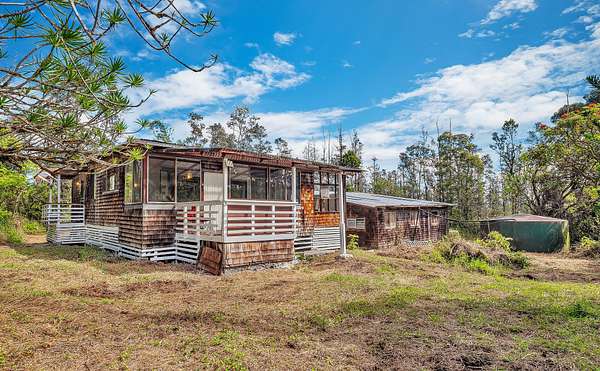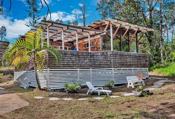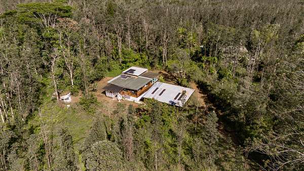Discover peaceful off-grid living on this fully permitted 1-bedroom, 1-bath home set on a private 3-acre property abutting the forest reserve, offering no rear neighbors and exceptional privacy. The home is filled with natural light thanks to an abundance of windows and features two lanais that create effortless indoor-outdoor living. Relax in the hot tub or mini soak tub, and enjoy the efficiency of a propane water heater and propane stove. The property is powered by solar electricity, with panels monitored through an app and operated by an Anker SOLIX F3800 Plus Portable Power Station. Water catchment supports a sustainable lifestyle. A detached garage offers exciting potential, with space for a future loft and bathroom-ideal for guests, a studio, or additional living area (buyer to verify). The home is fully permitted and eligible for conventional financing, making this a rare opportunity to own a private, light-filled retreat with forest reserve frontage and modern off-grid conveniences.