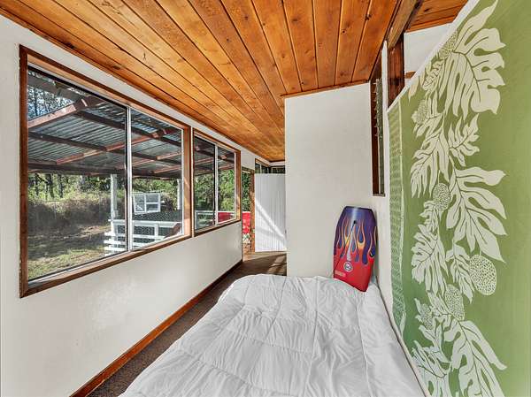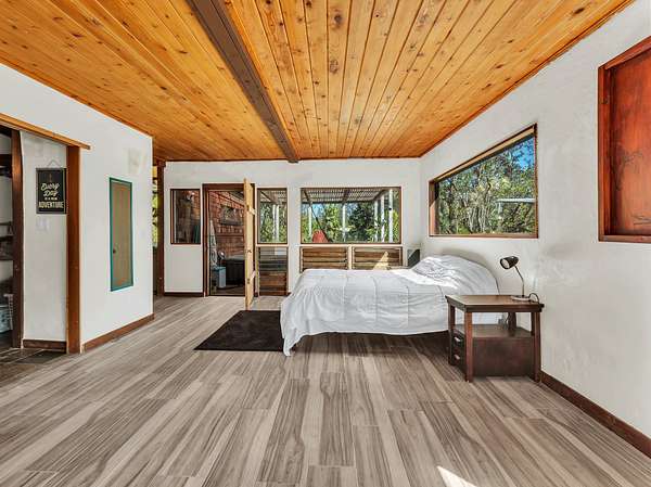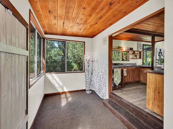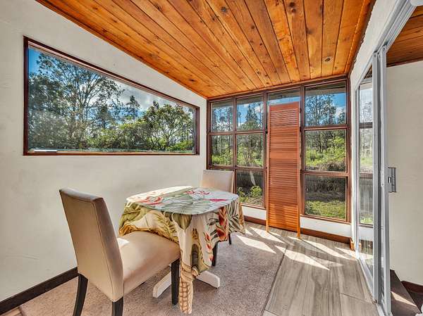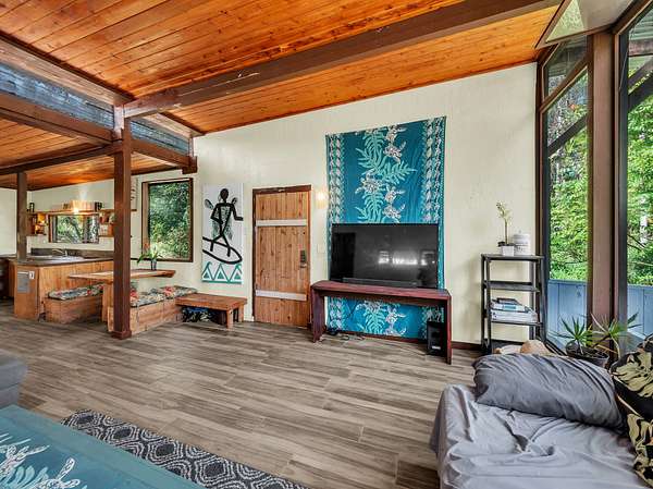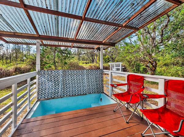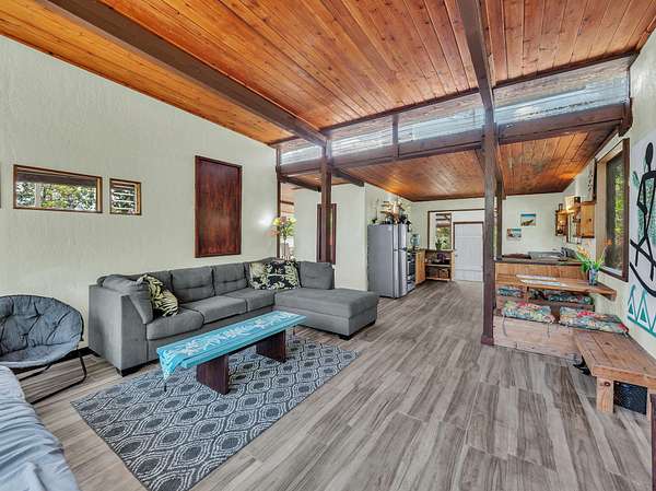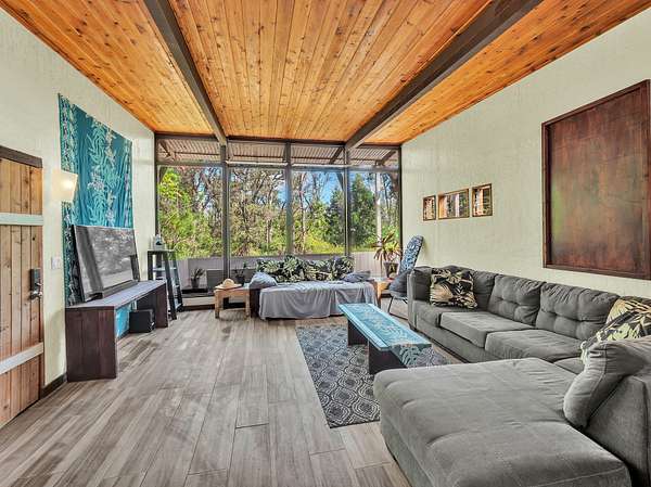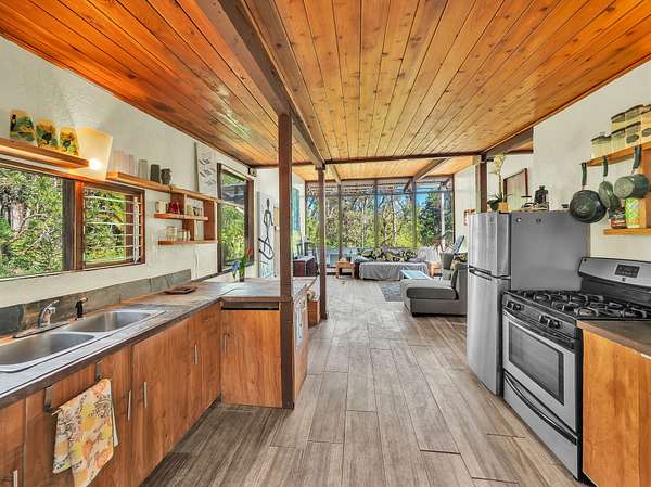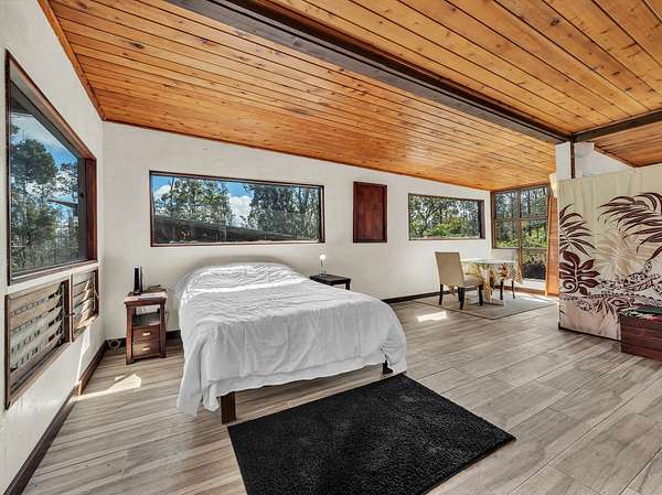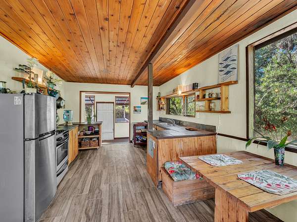 Discover peaceful off-grid living on this fully permitted 1-bedroom, 1-bath home set on a private 3-acre property abutting the forest reserve, offering no rear neighbors and exceptional privacy. The home is filled with natural light thanks to an abundance of windows and features two lanais that create effortless indoor-outdoor living. Relax in the hot tub or mini soak tub, and enjoy the efficiency of a propane water heater and propane stove. The property is powered by solar electricity, with panels monitored through an app and operated by an Anker SOLIX F3800 Plus Portable Power Station. Water catchment supports a sustainable lifestyle. A detached garage offers exciting potential, with space for a future loft and bathroom-ideal for guests, a studio, or additional living area (buyer to verify). The home is fully permitted and eligible for conventional financing, making this a rare opportunity to own a private, light-filled retreat with forest reserve frontage and modern off-grid conveniences.
