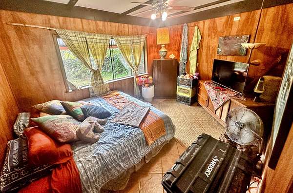 Welcome to your custom built two story home. UPSTAIRS comprised of the main living quarters enhanced with high open beam ceilings and large windows that lets in natural lighting. Open concept kitchen and all wood living room with gas stove, granite countertops and an island. The front deck is perfect for entertaining guests while capturing the cool breeze overlooking your beautiful orchard of fruit trees and flowers. The master bedroom has a half bath, large closet with extra storage space above and AC. A second bedroom, closet and a full bath. The back deck has the utility sink, washer, and dryer. DOWNSTAIRS has one bedroom, one bath and a second room that attaches the inside stairwell to the upstairs currently used as a bedroom perfect for an Ohana unit, extended family or visitors. Behind the garage you got a large storage shed for your yard tools and workshop. An outside sink where you can easily set up shop for grilling and entertaining. Plenty of storage space and the batteries and everything you need for your catchment and solar systems. ORCHARD consists of many fruit-bearing trees across two acres of land that will feed your family and friends: lemons, tangerines, oranges, cacao, multiple varieties of avocado, mango, starfruit, jackfruit, mamay sapote, sapodilla, papaya, pineapple, vanilla ice cream bean, lychee, lilikoi, coconut, Brazilian cherries, jaboticaba, malabar nut, star apple, betel nut, rollinia, surinam cherry, moringa, achiote seeds, guava, and many more. Self sufficient property is fully fenced with a steel gate held on beautiful rock pillars. Powered by "owned" solar panels and an Outback inverter system net metered. On demand gas hot water system. Recently completed upgrades: brand new roof installed 2022, water pump, on demand gas heater and ceiling fans. Tools & lawnmower are available for sale and can be negotiated. Buyers to do own due diligence investigating all material facts.