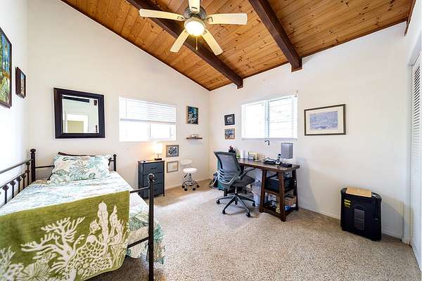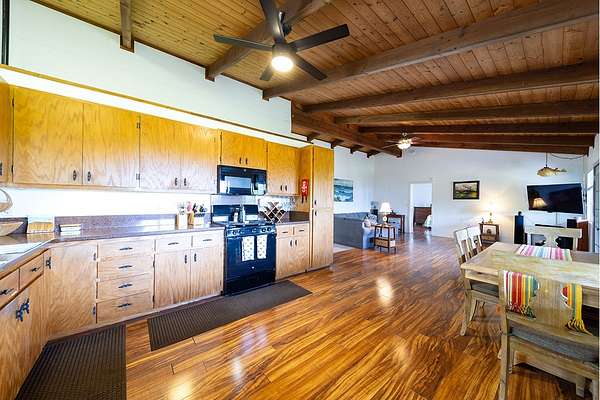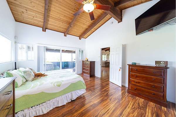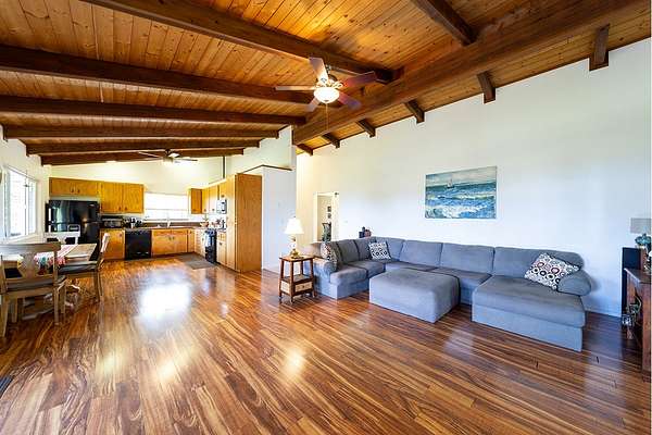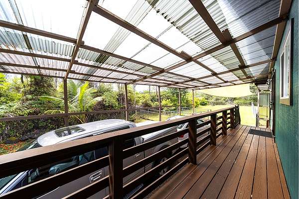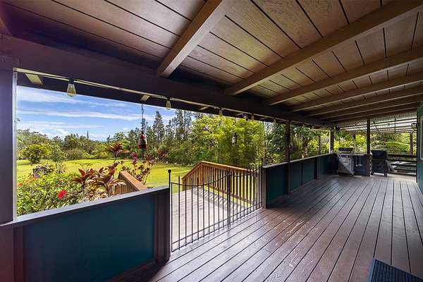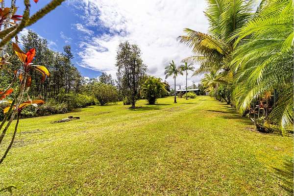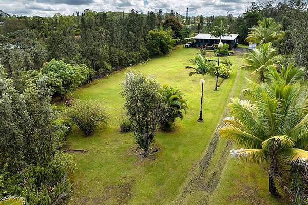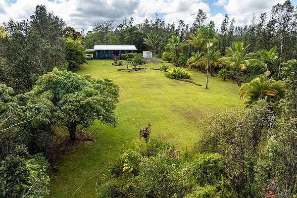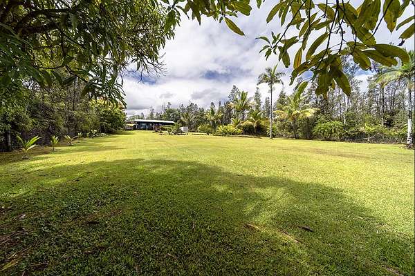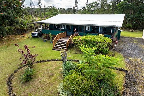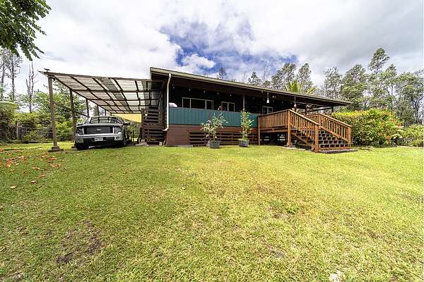 HAWAII COUNTRY HOME ON 3 LUSH TROPICAL ACRES Tucked away on the back half of a beautifully landscaped 3-acre lot, this charming home offers the perfect blend of privacy and space. Set far from the road, the residence is surrounded by natural beauty, providing a peaceful sanctuary that feels like your own private retreat. Enjoy the peace.. just open skies, mature trees, and the soothing sounds of nature. Gated, private tropical park like setting with mature ornamental & fruit trees and herb garden. Solar powered gate and fenced in yard with a (2023) 20'container complete with 2 solar panels. Underground utilities. Nice ocean view through the ohia forest. 3 bedrooms, 2 full baths. Conveniently located between the two secondary rooms is a well-appointed guest bathroom, providing easy access and a functional layout ideal for everyday living. No other homes or structures are visible from the large and covered lanai that spans the entire front of the house. French door entry from your large lanai to the open living area and remodeled kitchen with Corian counters, newer appliances & a gas stove. Vaulted ceilings throughout, curly Koa laminate and tile flooring. Storage loft in each bedroom. The ensuite opens onto the lanai with a 400-gal hot tub. Conveniently located laundry with Samsung Washer/Dryer, cabinets & shelves. Solid doors. Large hallway pantry. 8' sliders, mil-guard windows & sliders. Large carport freshly painted. Security system. Home is clean & pristine, move in ready. Coconut palm & mango trees, blackberry, blueberry, pineapple, raspberry, tomato, jalapenos, Hawaiian chili peppers and Hawaiian ornamentals.