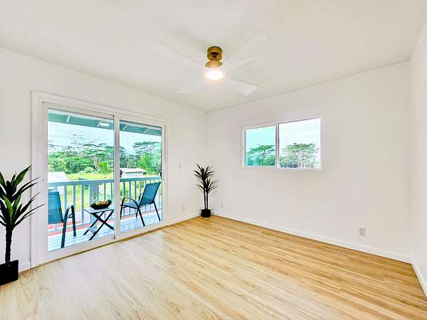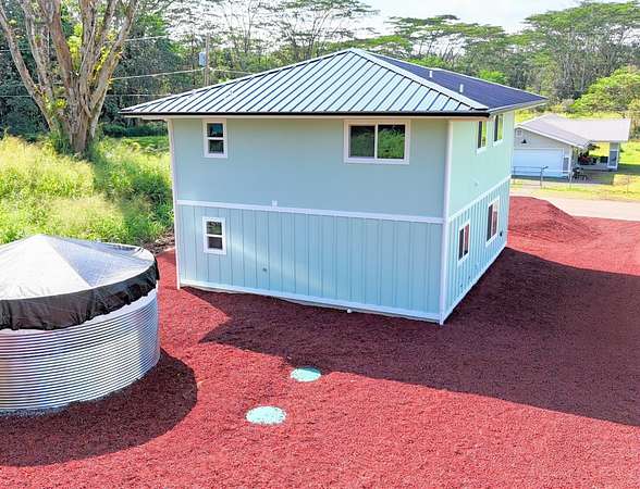 This is attainable housing at its finest: maximum efficiency, minimum compromise, and exceptional value. It all starts with location. In this instance: Tiki Gardens, located just outside of Pahoa and ideally positioned near both Pahoa and Keaau. But there's more-paved roads, low-density development, overhead power, and a Lava Hazard Zone 3 classification, which can mean significantly lower homeowners insurance premiums compared to much of Pahoa in Zone 2. Pahoa and Keaau offer shopping, dining, banking, schools, post offices, and parks, while nearby Hilo provides the international airport, UH Hilo, and additional conveniences. Sited at the end of the paved portion of Sandalwood Court on a fully cleared lot, this turnkey home offers comfortable living with room to grow. Thoughtful details stand out immediately, beginning with the recessed, covered French door entry. Inside, the open living concept showcases quality materials and fixtures-warm wood-tone flooring, neutral walls, shaker cabinets, solid-surface countertops, and stainless-steel appliances-creating a timeless style suited to any furnishings. A full bathroom near the kitchen and stairs supports guests and future expansion, featuring a smart mirror, shaker cabinetry, solid-surface counters, black fixtures, and brass-tone accents. The functional floor plan includes two levels, with three bedrooms, laundry, and a full bathroom upstairs. The largest bedroom features a balcony perfect for sunset views or quiet mornings with birdsong, island coffee, and local fruit. The upstairs bathroom includes a walk-in shower and matching finishes throughout. A small carport adds flexibility for parking, storage, or outdoor living. An adjacent utility closet may allow conversion to additional living space, or the home can be expanded forward for more covered parking-options well worth exploring at this price point.