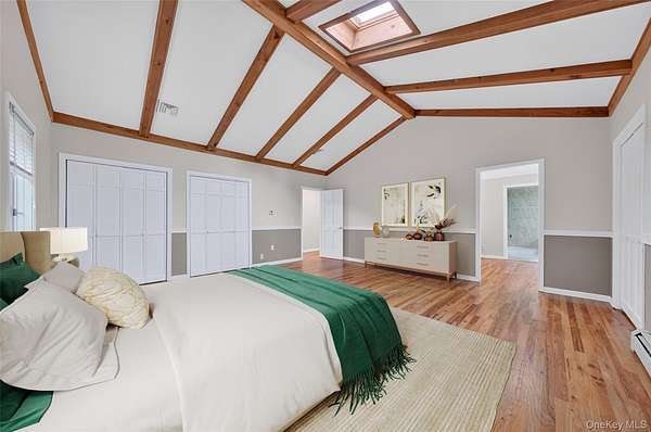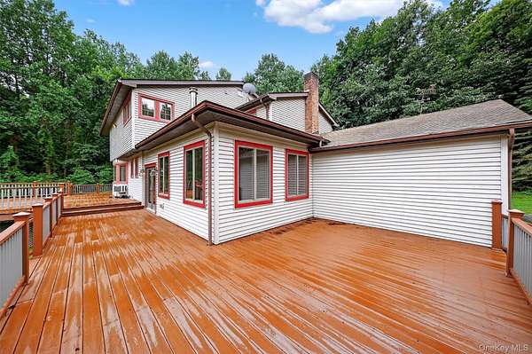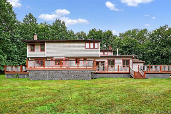 Newly updated, Stunning colonial home nestled on 3.2 acres of private paradise with central AC. Step through the charming covered rocking chair front porch & into a sun-drenched living room. Unwind & enjoy cozy evenings by the wood-burning fire. Kick back & relax in the sunroom with/ recessed lighting & a woodstove. Breeze through the French doors to a grand deck, offering an ideal setting for summer barbecues & outdoor parties. Bright, expansive windows and skylights fill the home with/ natural light, making every corner inviting & warm. Upstairs are 4 oversized bedrooms & closets galore. The large primary suite, a serene retreat, with cathedral ceilings, 4 closets, & ensuite bathroom featuring a huge jetted bathtub & a separate tiled shower. The eat-in kitchen is so large that there is an option of using the separate formal dining room as a first-floor bedroom.