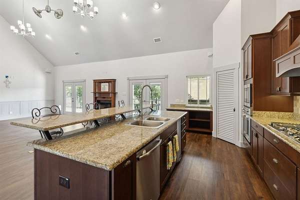 - Cathedral Ceiling(s), Decorative Lighting, Double Vanity, Flat Screen Wiring, Granite Counters, High Speed Internet Available, In-Law Suite Floorplan, Kitchen Island, Natural Woodwork, Open Floorplan, Pantry, Second Primary Bedroom, Smart Home System, Sound System Wiring, Vaulted Ceiling(s), Wainscoting, Walk-In Closet(s), Wired For Data