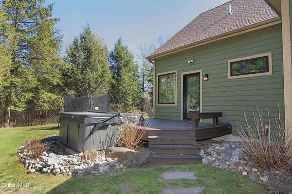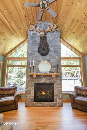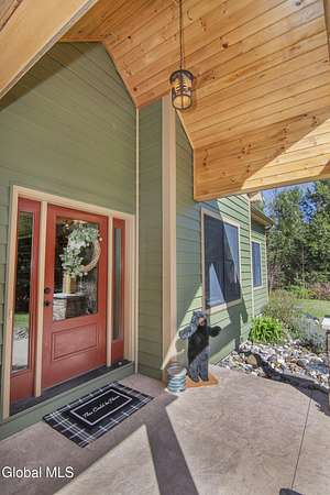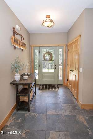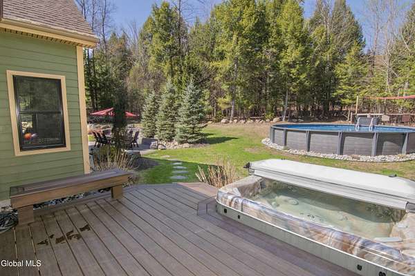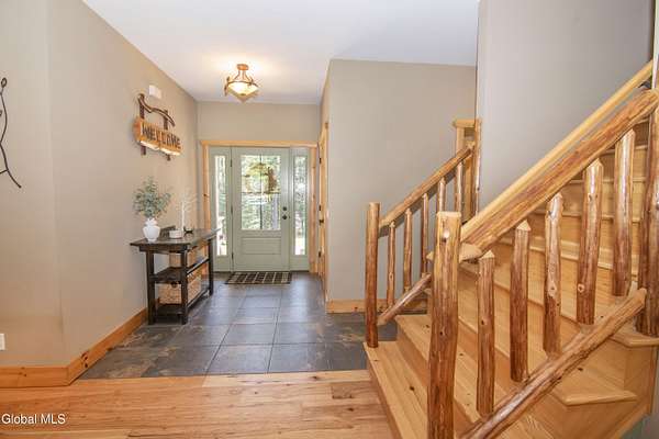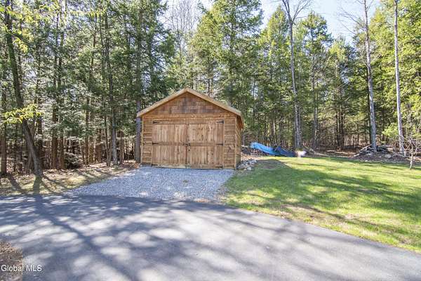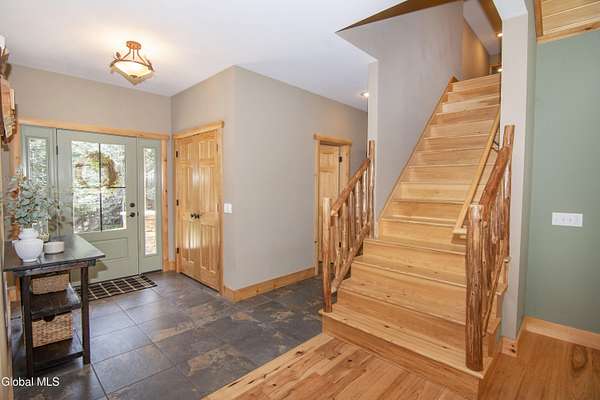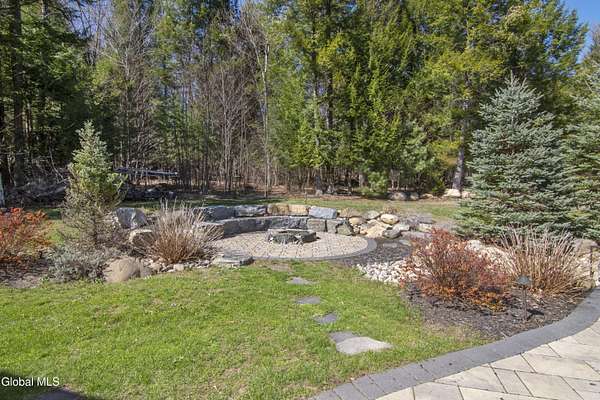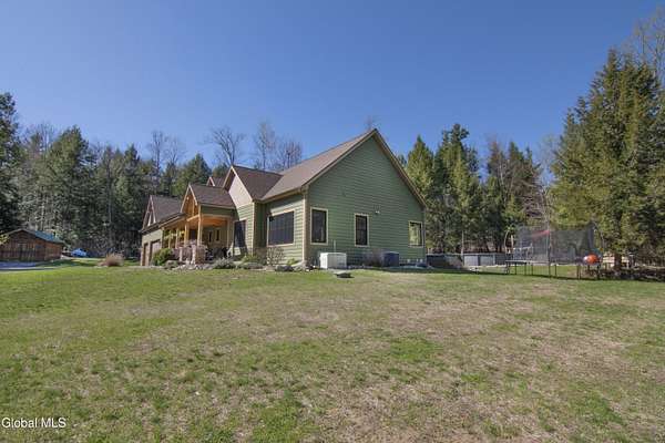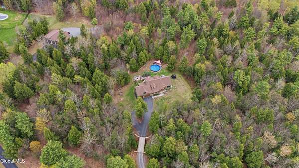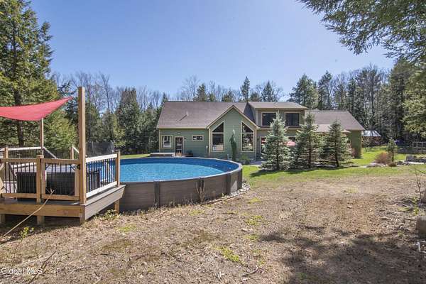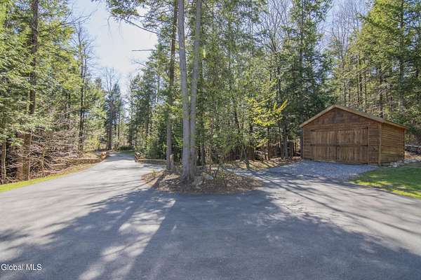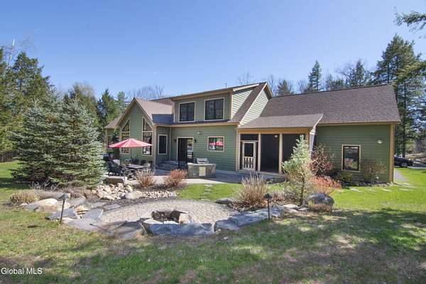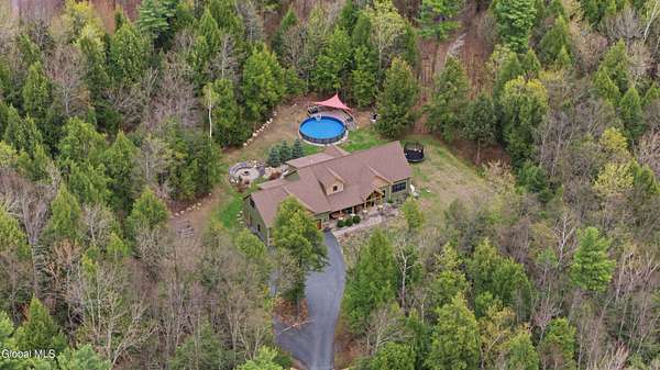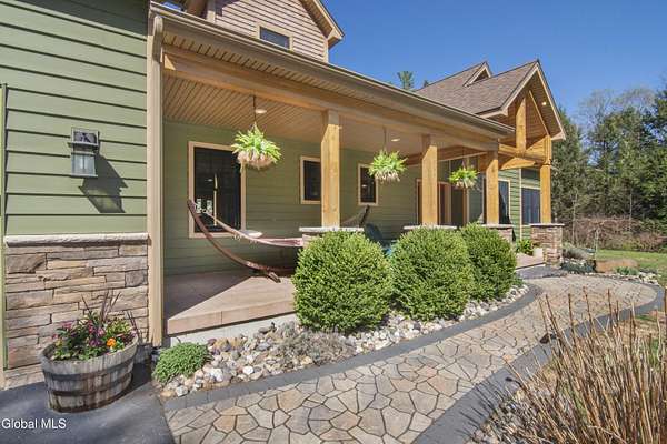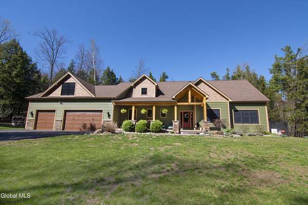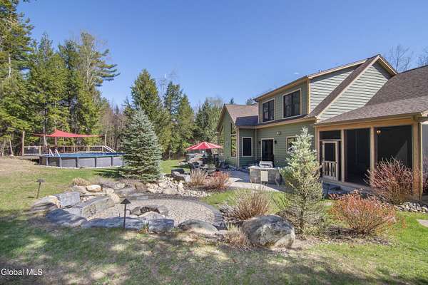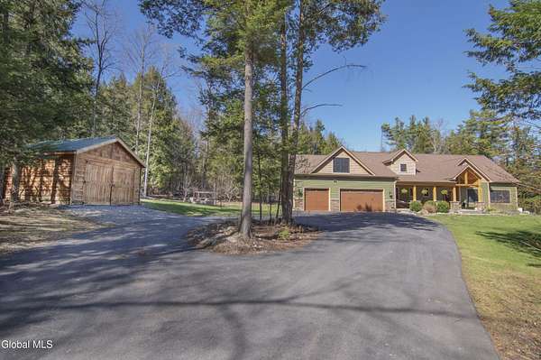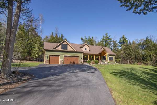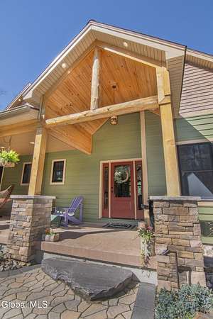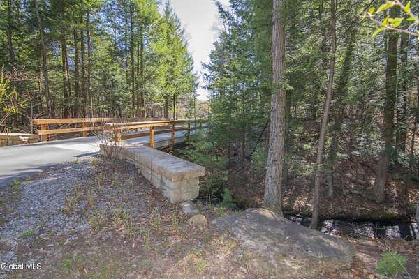 Discover Your Own Private Adirondack Retreat: Luxury Meets Nature just 9 mi. from Downtown Saratoga. Nestled in the serene landscapes of Greenfield, within the Saratoga Springs School District, this exquisite custom Adirondack home offers a harmonious blend of luxury and nature. This stunning rustic-modern home was thoughtfully designed by the sellers and built by Cartier Construction in 2017 with great consideration for privacy, efficiency, and capturing its unique setting. Overlooking the picturesque 3-mile Peacock Brook, the home is accessed via its own private highway-rated bridge and encircled in trees. Groomed trails leading to miles of recreational state land make this six-acre setting feel like hundreds, and it offers a cul-de-sac setting with mountain views and similar homes, reminding you that you're still part of a community. Adirondack design elements, natural materials, and fine finishings, create a warm, yet impressive place to entertain - and call home. Since purchase, the owners have enhanced the home further, by adding efficient radiant heat inside and intentional landscaping, fruit trees, an oversized and professional hardscaped patio, firepit, hot tub, saltwater pool with trex deck, and exterior lighting. Other interior highlights include: Hickory wide-plank engineered flooring, floor-to-ceiling granite gas fireplace and surround, rainforest marble countertops, custom pine trim work throughout, solid wood doors, hickory railings and stone cabinet knobs both sourced from the property, soaking tub and tiled primary shower, Andersen 400 series windows, Outside you'll find: screened porch, 8-person hot tub off the primary suite, upgraded insulated vinyl shakes/horizontal siding, auto generator backup, covered front porch with timber frame entry and more! This haven feels like your own Lake Placid lodge inside and out, but offers the proximity to Saratoga and the Capital Region. See it for yourself!