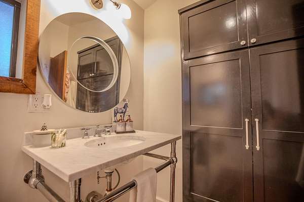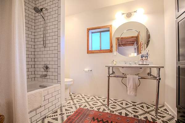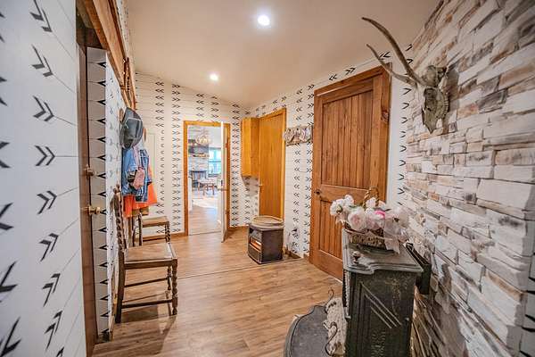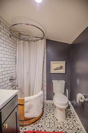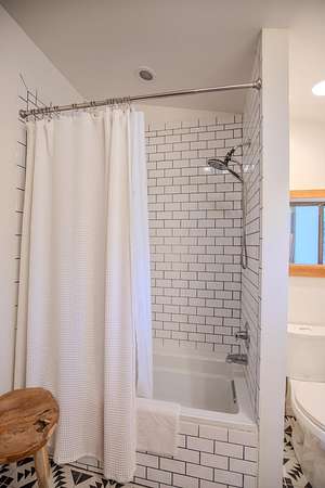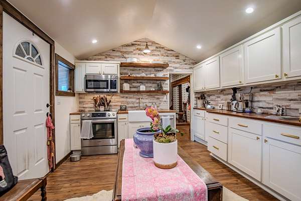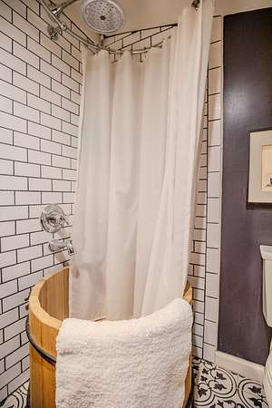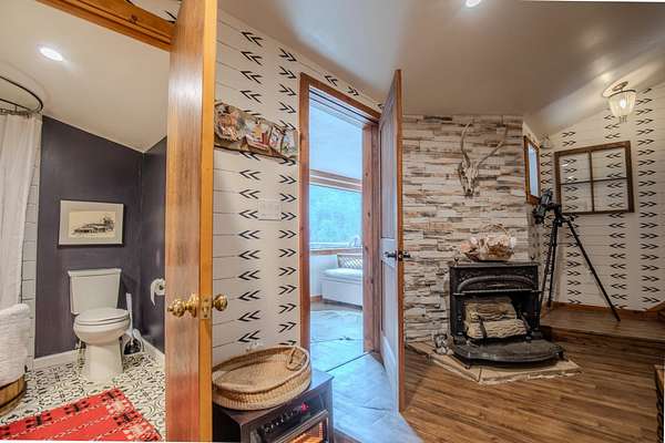 - 1/2 Bath, Block Countertops, Carpet, Flooring, Pellet, Shower, Stove, Sunroom, Tub & Shower, Vinyl, Wood