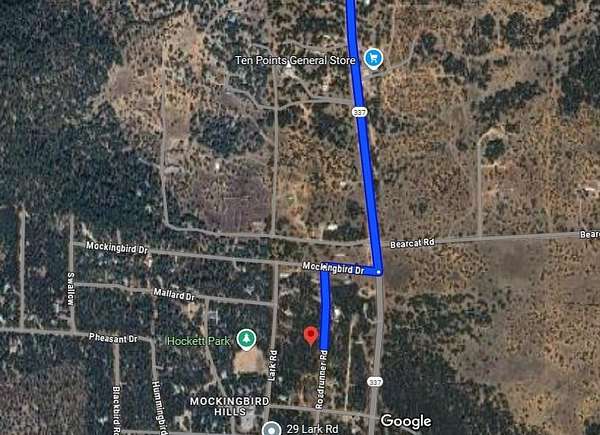 From Wells Fargo Bank in Tijeras, Go south on NM 337 (south 14)18 min (13.5 mi) Take right (west)Continue on Mockingbird Dr. Take next left (south).which is Roadrunner. Lot on right (west) side of road.