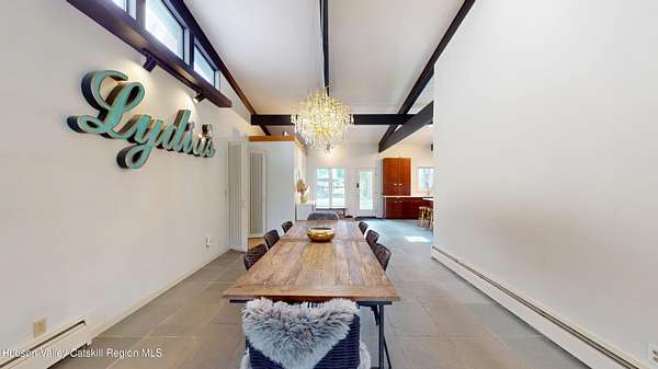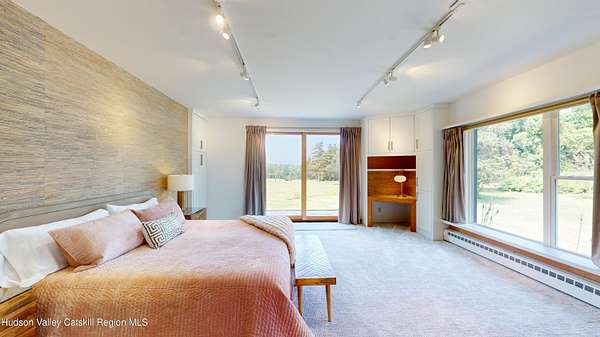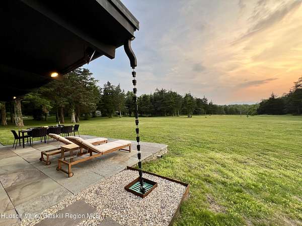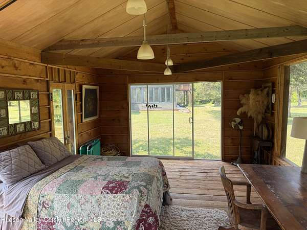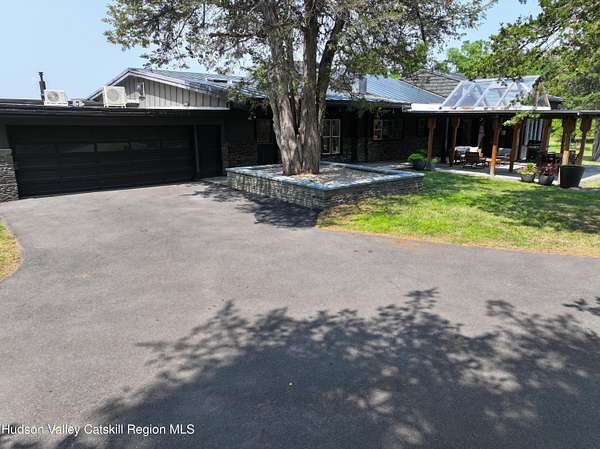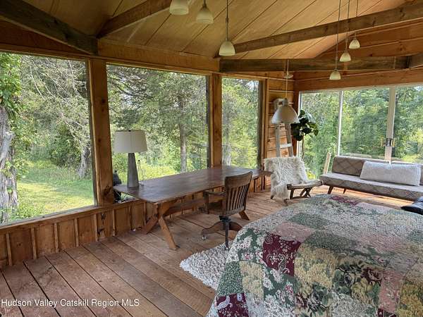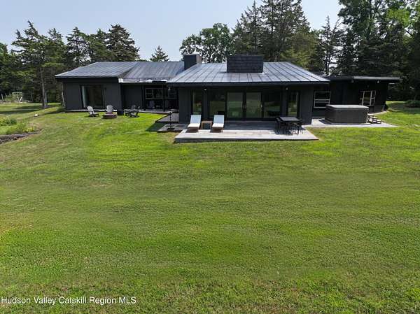 Tucked away on a sprawling, private 11 acre lot just minutes from downtown Hudson, this fully furnished modern retreat offers the perfect blend of style, space, and seclusion. Designed with clean architectural lines and mid-century flair, the home features soaring ceilings with exposed beams, large slate tile floors, and sun-drenched living spaces framed by oversized windows. The open-concept layout includes a chef's kitchen with custom cabinetry and a generous island, a sophisticated dining area crowned by a sparkling chandelier, and a cozy living room with a fireplace and built-in entertainment center. Multiple lounge areas offer panoramic views of the lush, wooded surroundings. In addition to the main home, a separate studio space provides endless possibilities, perfect for a home office, art studio, or guest suite. Outside, the expansive grounds include open lawn, mature trees, and a garden ideal for growing vegetables, herbs, or flowers. This one-of-a-kind property delivers elegance, comfort, and privacy just 2 hours from NYC. The home comes fully furnished (down to the linens and towels) and utilities are included, so it is truly turn-key!
