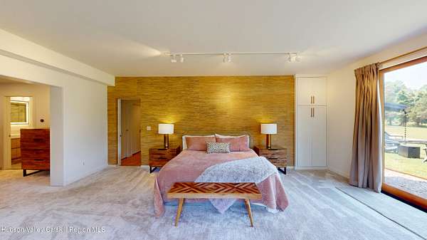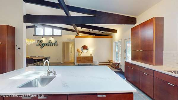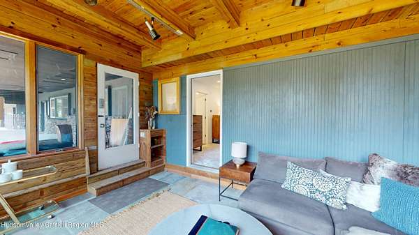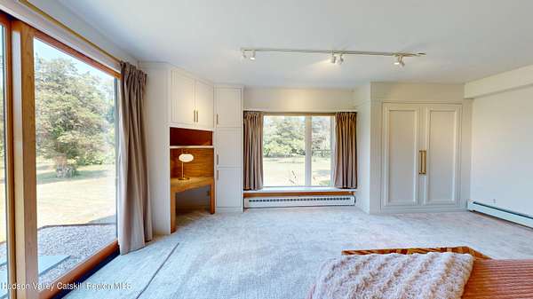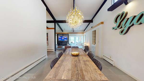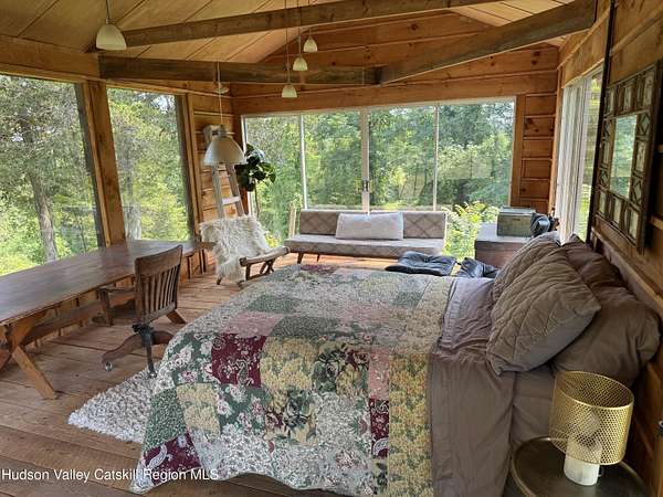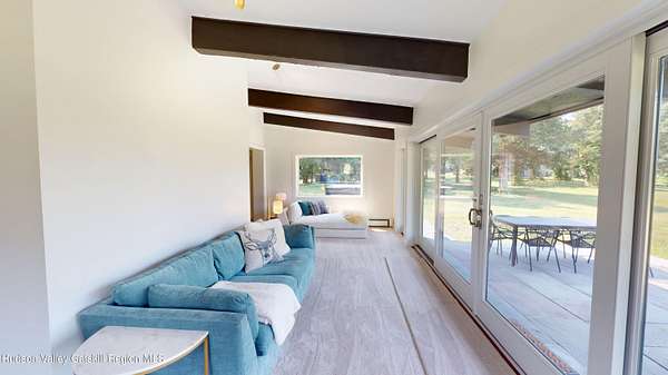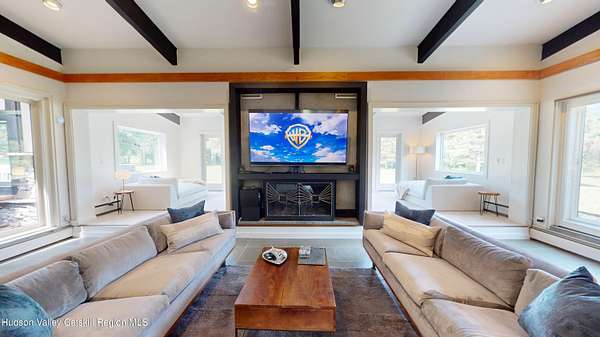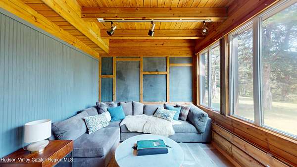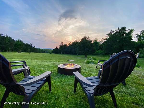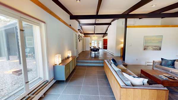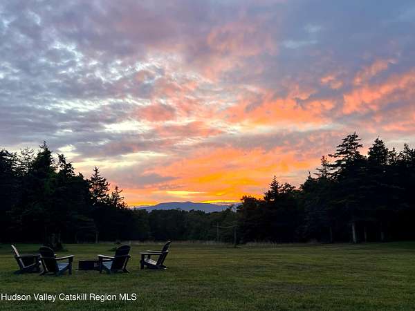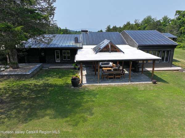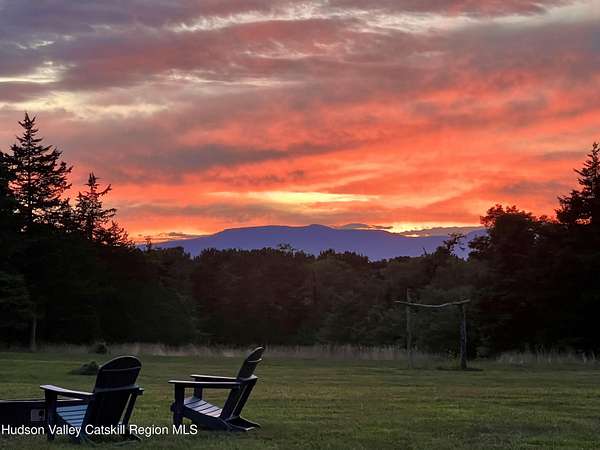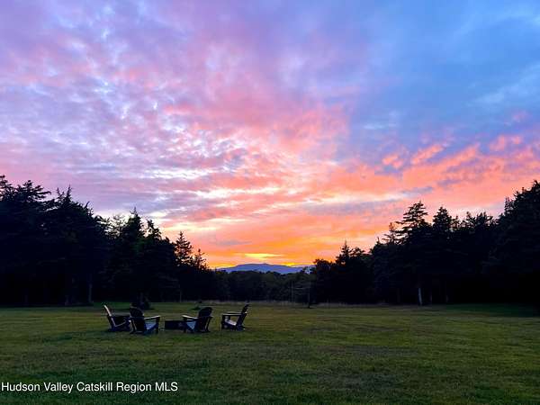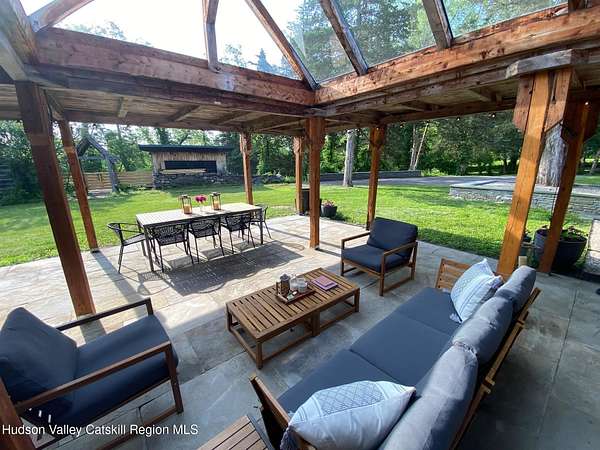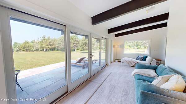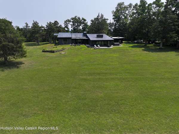 Spend your summer in Hudson, NY with this fully furnished seasonal rental available from Memorial Day through Labor Day, tucked away on a sprawling, private 15-acre lot just minutes from downtown. This modern retreat offers the perfect blend of style, space, and seclusion. Designed with clean architectural lines and mid-century flair, the home features soaring ceilings with exposed beams, large slate tile floors, and sun-drenched living spaces framed by oversized windows that bring the outdoors in. The open concept layout is ideal for summer living and entertaining, with a chef's kitchen featuring custom cabinetry and a generous island, a sophisticated dining area highlighted by a statement chandelier, and a cozy living room with a fireplace and built in entertainment center. Multiple lounge areas provide peaceful spots to relax while taking in panoramic views of the lush, wooded surroundings. A separate studio space adds flexibility, perfect for a home office, art studio, or guest suite during your stay. Outside, enjoy the expansive grounds with open lawn, mature trees, and a garden ready for summer growing, ideal for fresh herbs, vegetables, or flowers. Whether you're hosting, unwinding, or exploring the Hudson Valley, this property offers a true seasonal escape. Located just 10 minutes from Hudson's vibrant shops, restaurants, and galleries, and only 2 hours from NYC, this one-of-a-kind home delivers elegance, comfort, and privacy in a prime summer setting. The home is fully furnished, including linens and towels, with utilities included, making it completely turnkey for your summer stay.