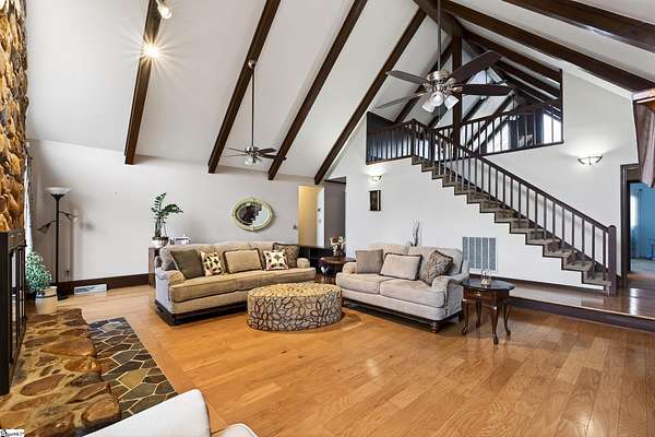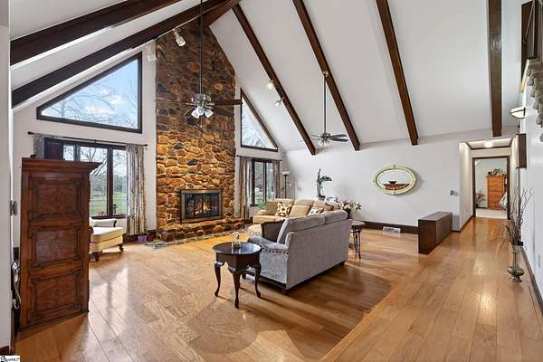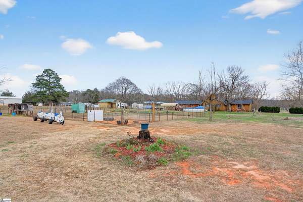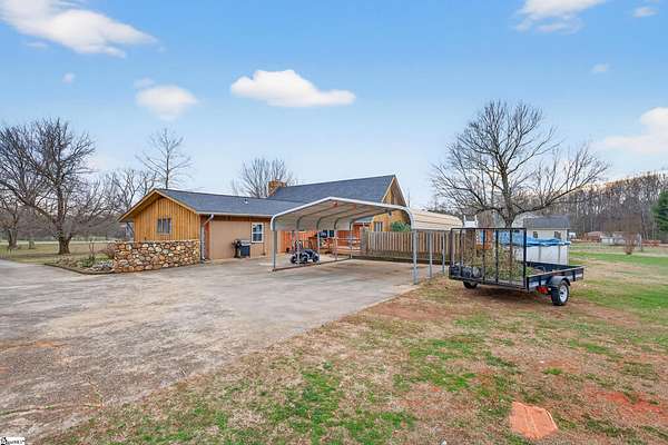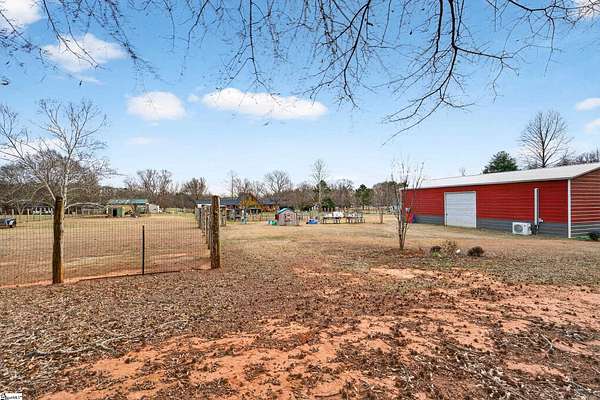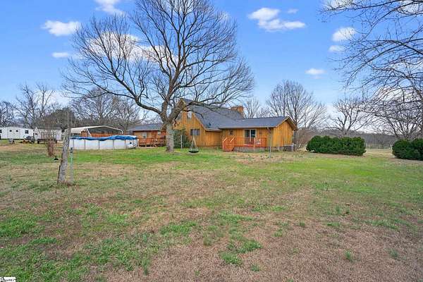 NO HOA!! USDA eligible! Peaceful rural living with quick access to the Upstate's top cities, shopping, and recreation! Set on 3 ACRES in an award-winning school district, this one-of-a-kind property delivers peaceful country living without sacrificing convenience. The home is also within walking distance of the Stoneybrook Neighborhood Fishing Lake and is surrounded by large lots while backing up to a tree line for privacy, beautiful views of farmland in front, and a true sense of retreat. Inside, the home features stunning REAL WOOD beams on vaulted ceilings, solid wood doors, and a dramatic 8-foot-wide TOWERING STONE FIREPLACE with a nostalgic cooking grate, matched by a stone wall in the foyer. The sunken living room, oversized loft, country-style eat-in kitchen, and formal dining room just off the kitchen create a layout that is both inviting and functional, all filled with natural light. The kitchen boasts real GRANITE countertops, not cultured granite, along with a new refrigerator and dishwasher, as well as an Insta-Hot water heater for endless hot water. ALL APPLIANCES INCLUDED! The home includes dual primary bathrooms, one with a vintage sunken tub and the other full baths featuring tiled walk-in showers, plus a large laundry room with a mud sink. Two new ceiling fans were added in the loft, the attic has newly added 8" of blown insulation and is mostly floored for storage. The converted garage adds 400 square feet of heated and cooled living space. Outdoor living is equally impressive, with a deck off the massive primary bedroom and a large custom deck off the dining room that wraps around the 15x24 SALTWATER POOL. The courtyard features a beautiful stone wall, while flowering bushes, mature trees, and landscaped flowerbeds line the driveways and grounds and return in full bloom each spring. Multiple fruit trees including apple, cherry, and peach are already planted. The property has two driveways, one leading to the courtyard and the other providing direct access to the large outbuilding at the back of the acreage. There is a BARN and TWO FENCED PASTURES for livestock, chicken coop and rabbit cages, a WORKSHOP with electricity and work benches, and a separate storage shed that is wired for electricity. Major updates include a NEW ROOF, a fully encapsulated crawlspace vapor barrier and all-new ductwork throughout the home, a new HVAC unit, four water spigots added for a total of six, septic tank recently pumped, and cedar siding and both decks are freshly stained. Completing this exceptional property is a 2023-built, fully permitted 30x50x14 OUTBUILDING on a concrete slab with insulation (1,500 sf), two 6-ton energy-efficient heat/air units, a bathroom, kitchenette, two main doors, a 10x12 roll-up door, its own septic system, its own 200-amp electrical meter, and its own water shutoff-- perfect for a workshop or business. Could also easily be converted into MOTHER-IN-LAW/GUEST SUITE. In addition, this PRIME LOCATION is just minutes from Greenville, Anderson, Easley, Clemson, Lake Hartwell, and premier shopping and dining, only 6 miles from a welcoming community with coffee shops, restaurants, and a well-equipped park, just 5 minutes to I-85, with Palmetto High School a 5-minute drive and Palmetto Middle School only 8 minutes away.