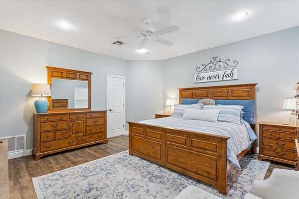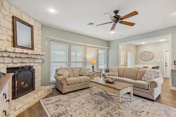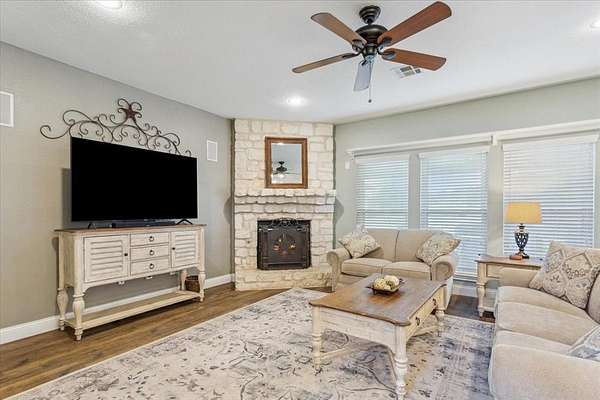 Inside, the home is warm and welcoming. The cozy living room--anchored by a stone fireplace--flows right into the beautifully updated kitchen with granite countertops and plenty of cabinet space. Whether you're cooking for a crowd or enjoying a quiet weekend at home, the layout just works. With the primary suite thoughtfully located downstairs and all secondary bedrooms upstairs, everyone gets space and privacy.