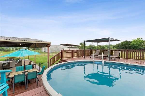 Step outside and the lifestyle you've imagined comes to life. A large covered back patio is ideal for gatherings, and the sparkling above-ground pool with surrounding deck offers the perfect place to cool off on hot Texas days. Beyond that, acres of open land stretch in every direction--perfect for exploring, riding, gardening, or simply soaking in the view.
