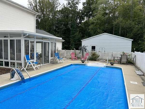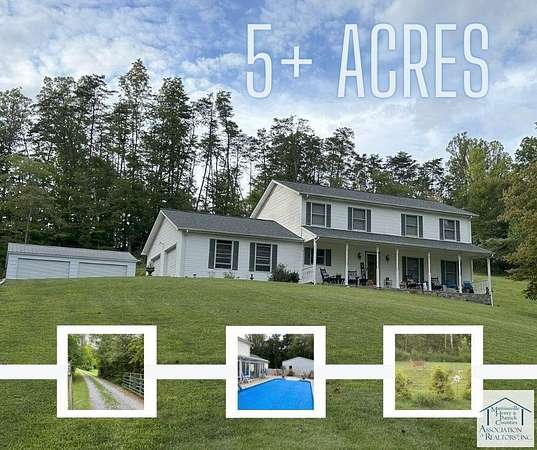 Welcome to your peaceful retreat! This stunning home perfectly balances seclusion and accessibility, situated on over 5 acres while being just a mile from shopping and dining options. As you enter, you'll be greeted by pristine hardwood floors that appear untouched. The spacious great room seamlessly connects to a formal dining area and living room, offering ample space for both relaxation and entertaining. Upstairs, the generously sized primary bedroom easily accommodates king-sized furniture and features an expansive walk-in closet, along with a luxurious four-piece en-suite bathroom. The second floor also includes two additional bedrooms, a bonus room, and a full bath. Recent upgrades, including a new roof, heat pump and stainless kitchen appliances are sure to ensure your comfort for years to come. The full unfinished basement and attached two-car garage, along with a separate detached two-car garage with extra storage, provide plenty of room for all your belongings and hobbies. Don't miss the charming creek that runs along the property, enhancing the tranquil atmosphere of your future home. Experience the beautiful views, the soothing sounds of nature, and the inviting in-ground pool for yourself!