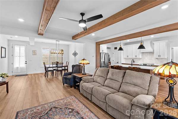 Charming 3-bedroom, 3-bath home on 1.5 private acres in Harmony! The kitchen opens to a great room with striking wooden ceiling beams and a convenient butler's pantry, creating a spacious and inviting entertaining area. Enjoy the large screened-in porch and the covered back deck overlooking the fenced play yard. The primary bedroom features recessed lighting and a huge walk-in closet. The primary bathroom includes a dual vanity, garden tub, tiled shower, natural light, and recessed lighting above the shower. Upgrades throughout include added cabinets and countertop in the room off the kitchen, attic storage, security system, and the parking pad next to the garage for parking an RV or trailer. This home combines thoughtful design, modern functionality, and charming details to create a space that is stylish, comfortable, and perfectly suited for seamless indoor and outdoor living on a private, serene lot. Don't miss out on this exceptional opportunity!