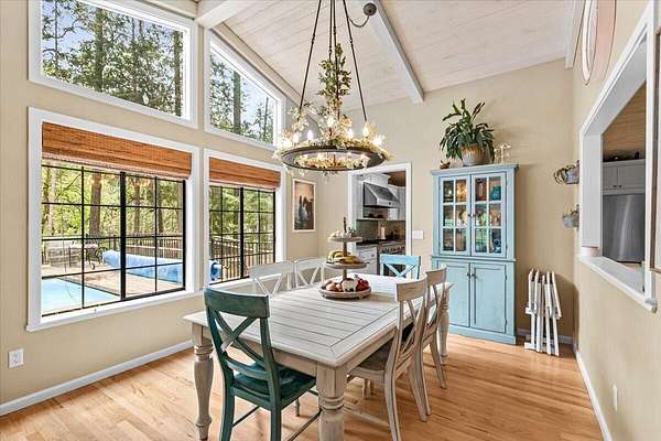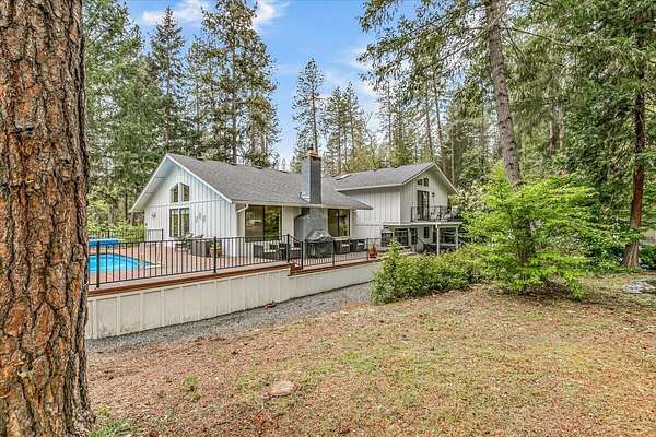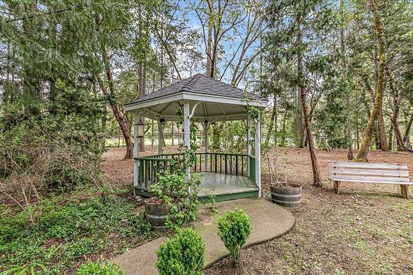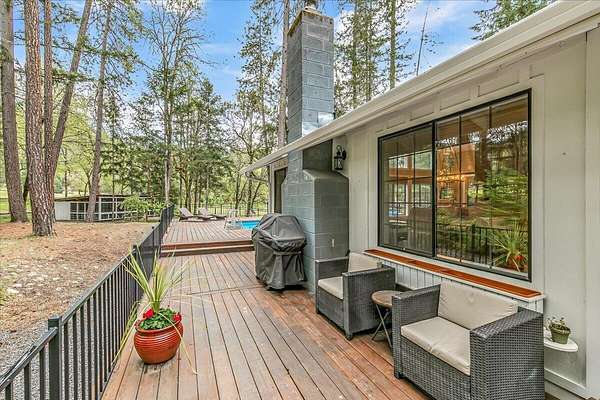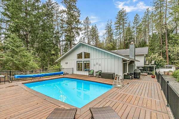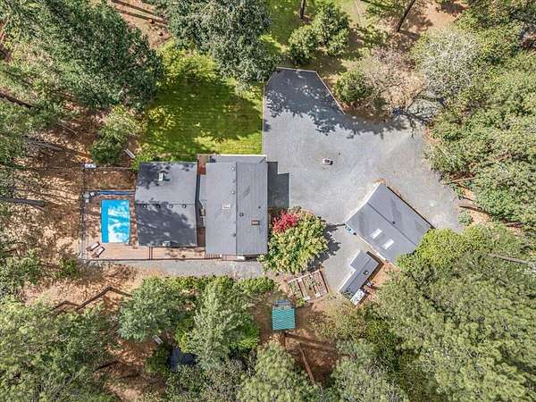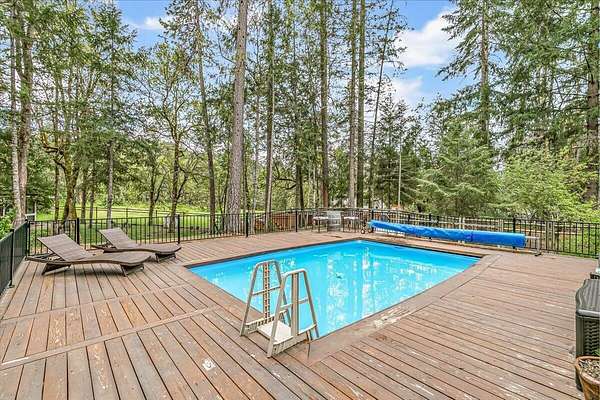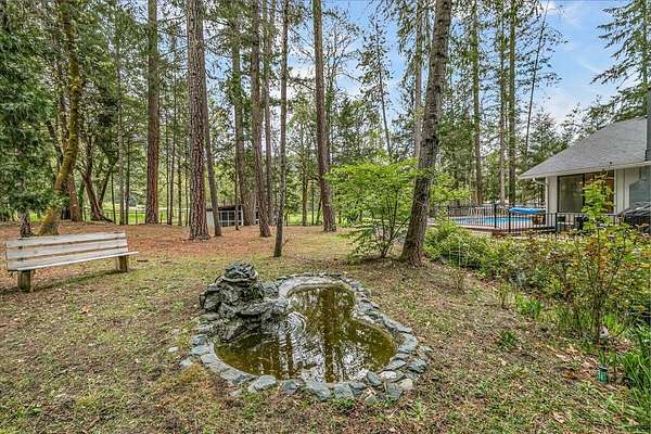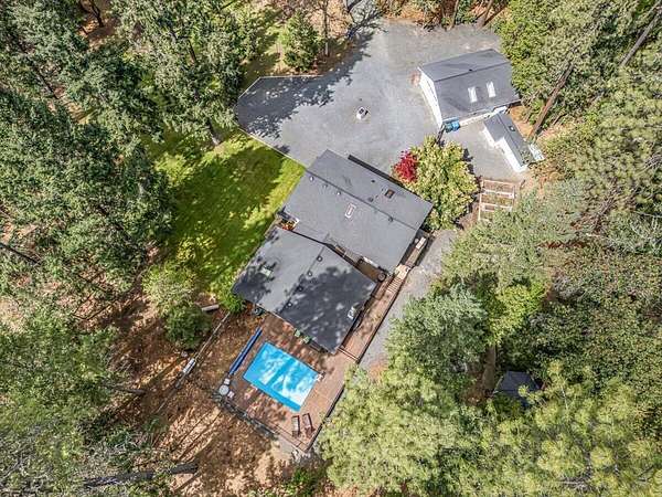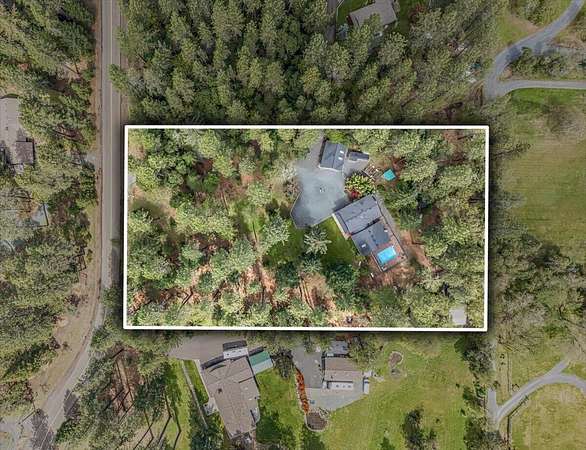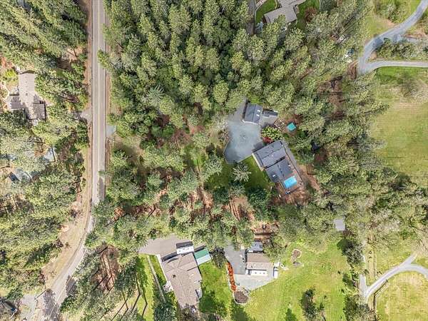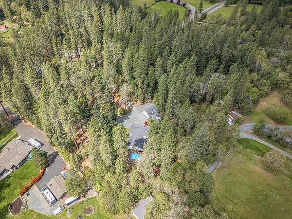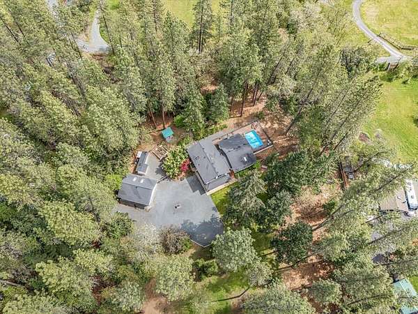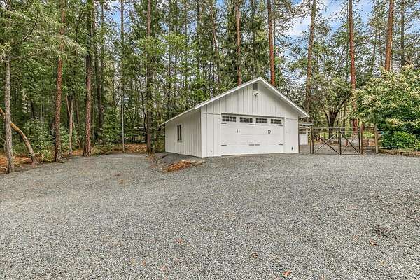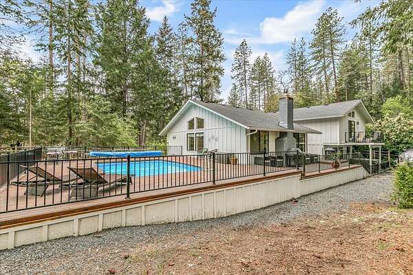 Beautiful, modern home with large, fully finished shop (w/220v) on 2.5 usable acres. This property features an automatic gate, graveled RV parking w/hookup (20,30,50 amp), recently built barn, swimming pool with deck surround, & outbuilding. Immaculate home features 3 bedrooms, 2.5 bathrooms, separate family & living rooms, hardwood floors and tile throughout, vaulted open-beam ceilings & gas fireplace. Chef's kitchen offers a 6-burner stainless gas range w/double ovens & hood, granite counters, tile backsplash, breakfast nook, ample cabinet space, and stainless Jenn Air appliances. Spacious primary suite has a vaulted ceiling, private balcony, attached bathroom with dual sinks, great counter space, soaking tub and shower. Large laundry room has a utility sink, cabinetry, and half bath. Landscaped backyard with gazebo, greenhouse, lovely pond, raised-bed garden & fruit trees. Attached 2 car garage plus bonus area great for extra storage. Top-quality finishes & pride of ownership.